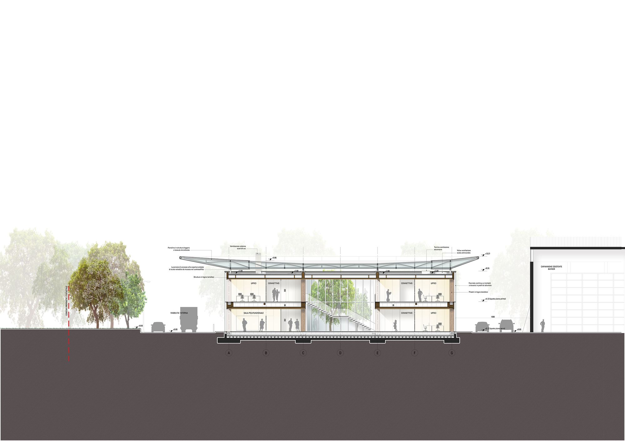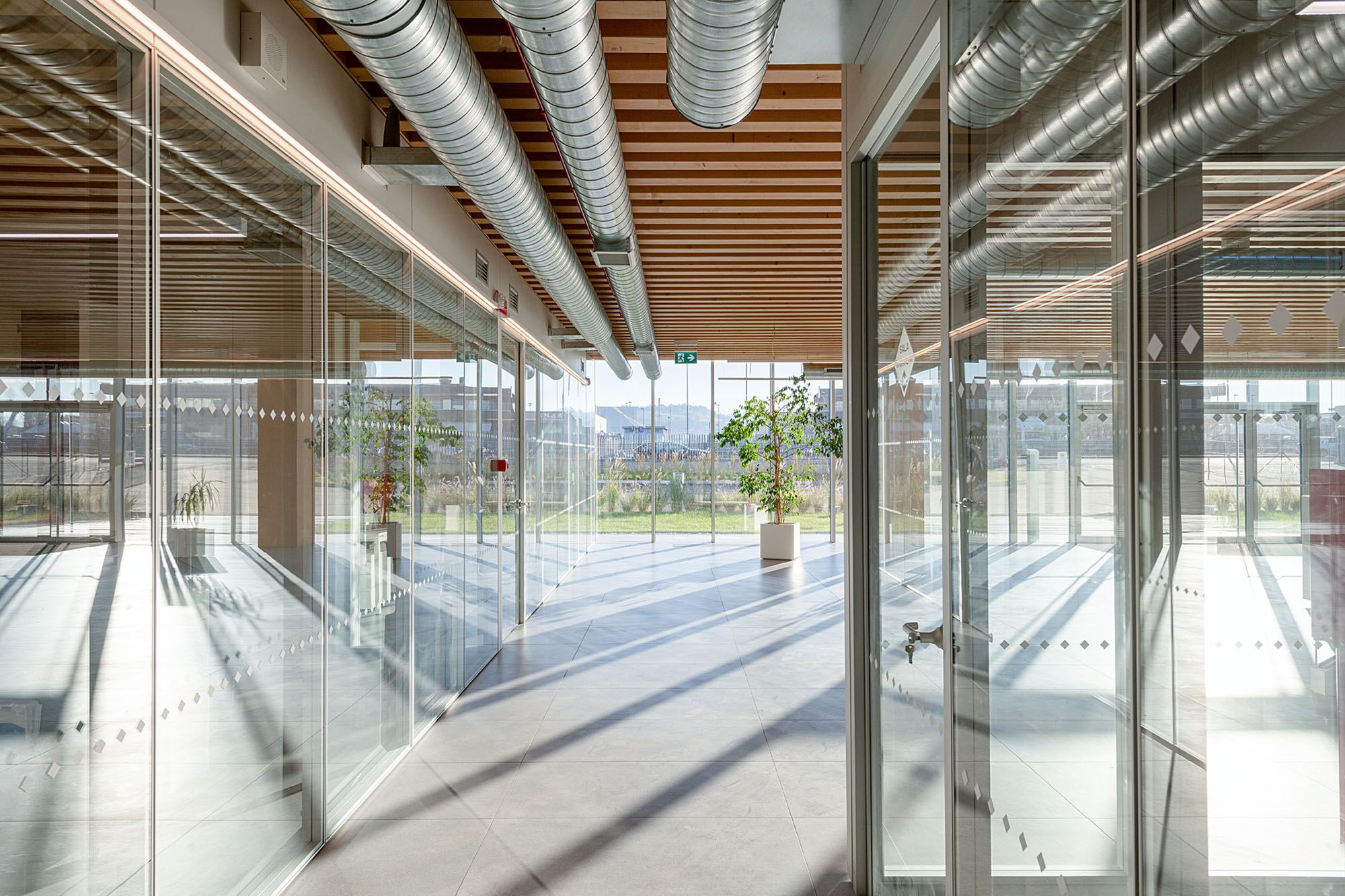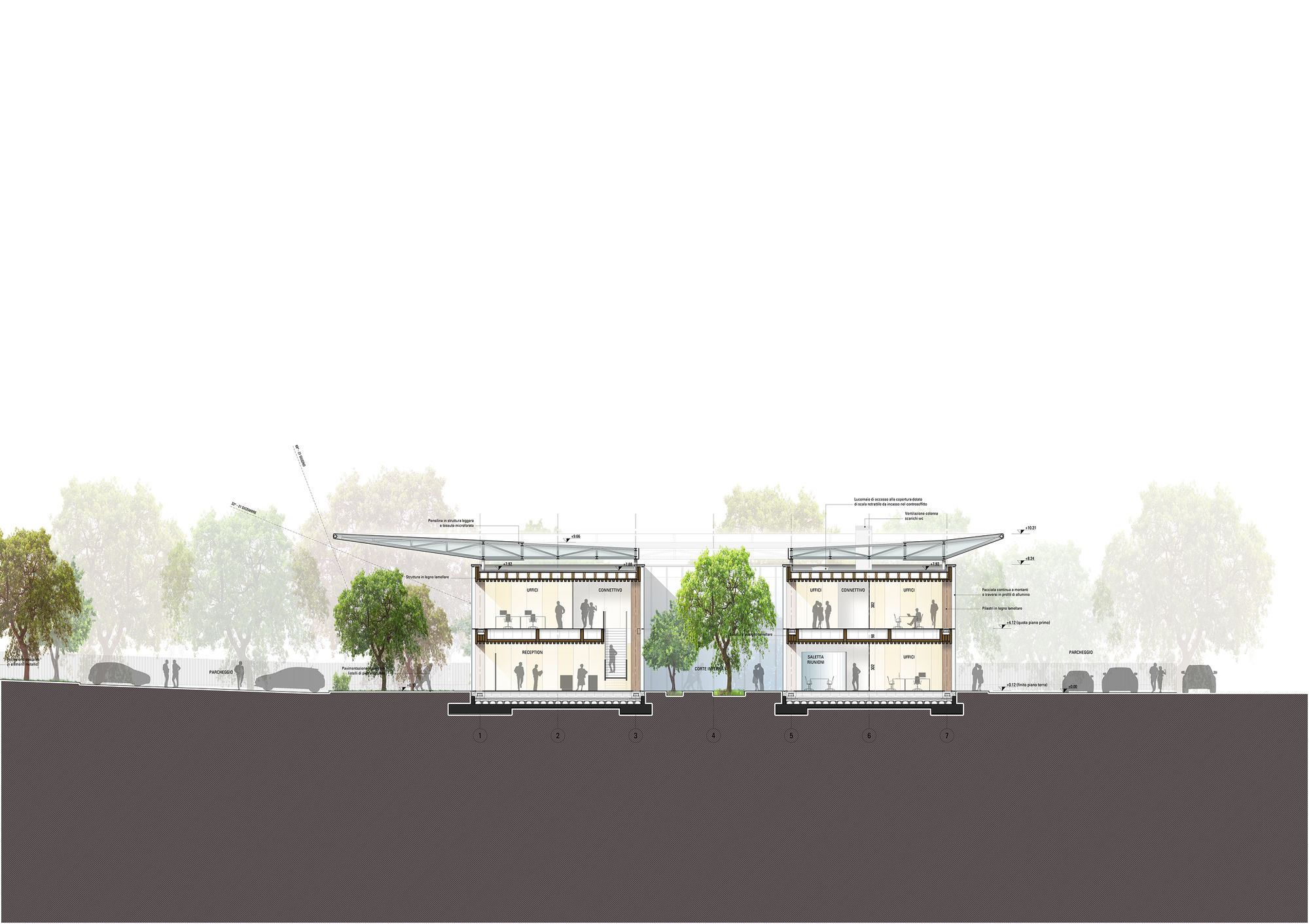 The project has paid considerable attention to the comfort of the interior environments, to the consequent well-being of the staff, and to the permeability of natural light; in this regard, the new building foresees a completely glazed external infill, thus ensuring great transparency towards the outside and facing an internal courtyard enriched with tree and shrubby essences.