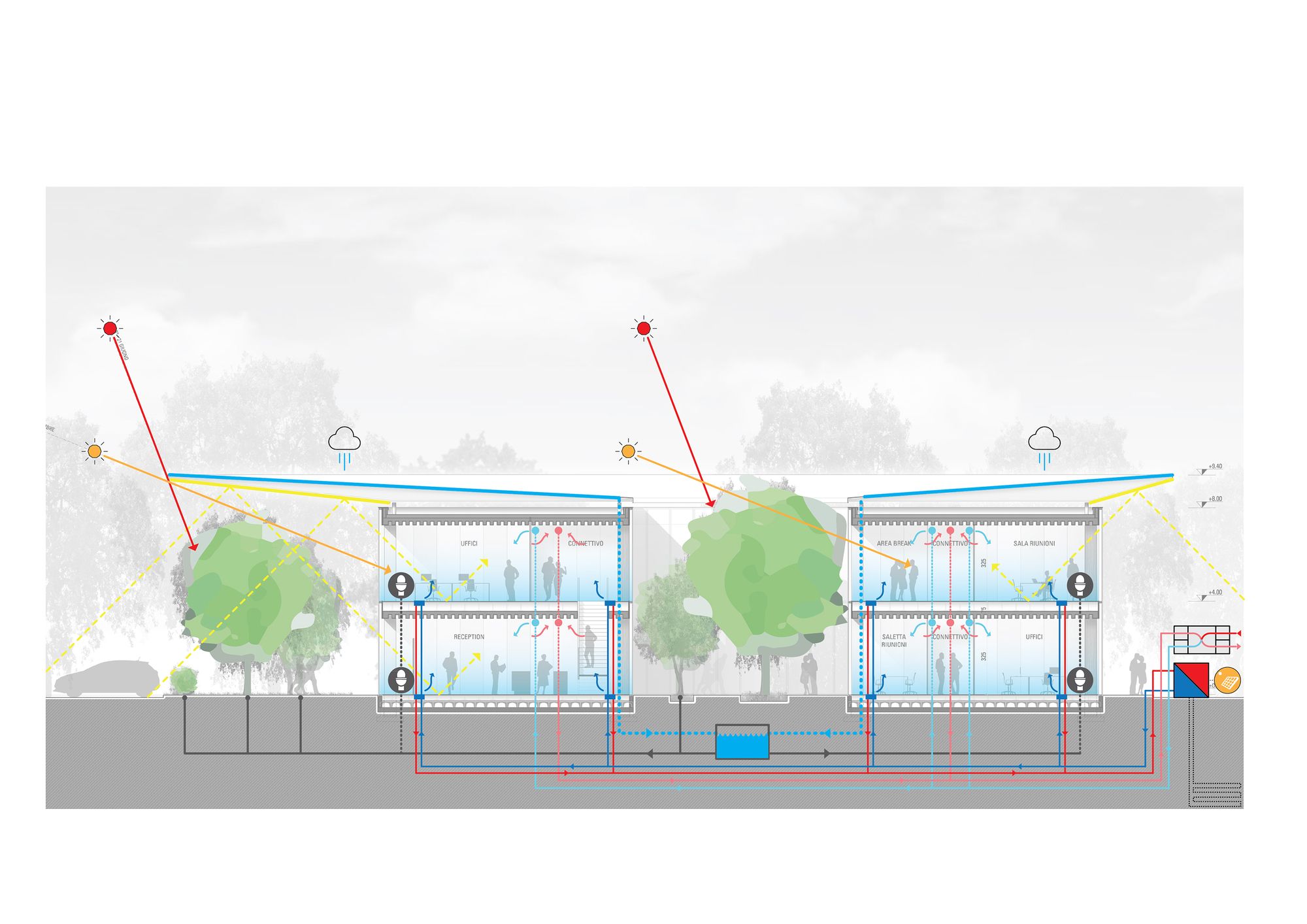 To protect the radiation on the glass curtain walls, the project involves the construction of an element with a strong aesthetic impact: a large covering sail on the external edge of the facades, which is able to reduce the entry of direct light and at the same time diffuse uniform natural light inside the offices; this large cover is characterized by different overhangs related to the orientation and the solar analysis, to manage the adequate input of the radiation according to the sun exposure and the needs of the individual fronts.