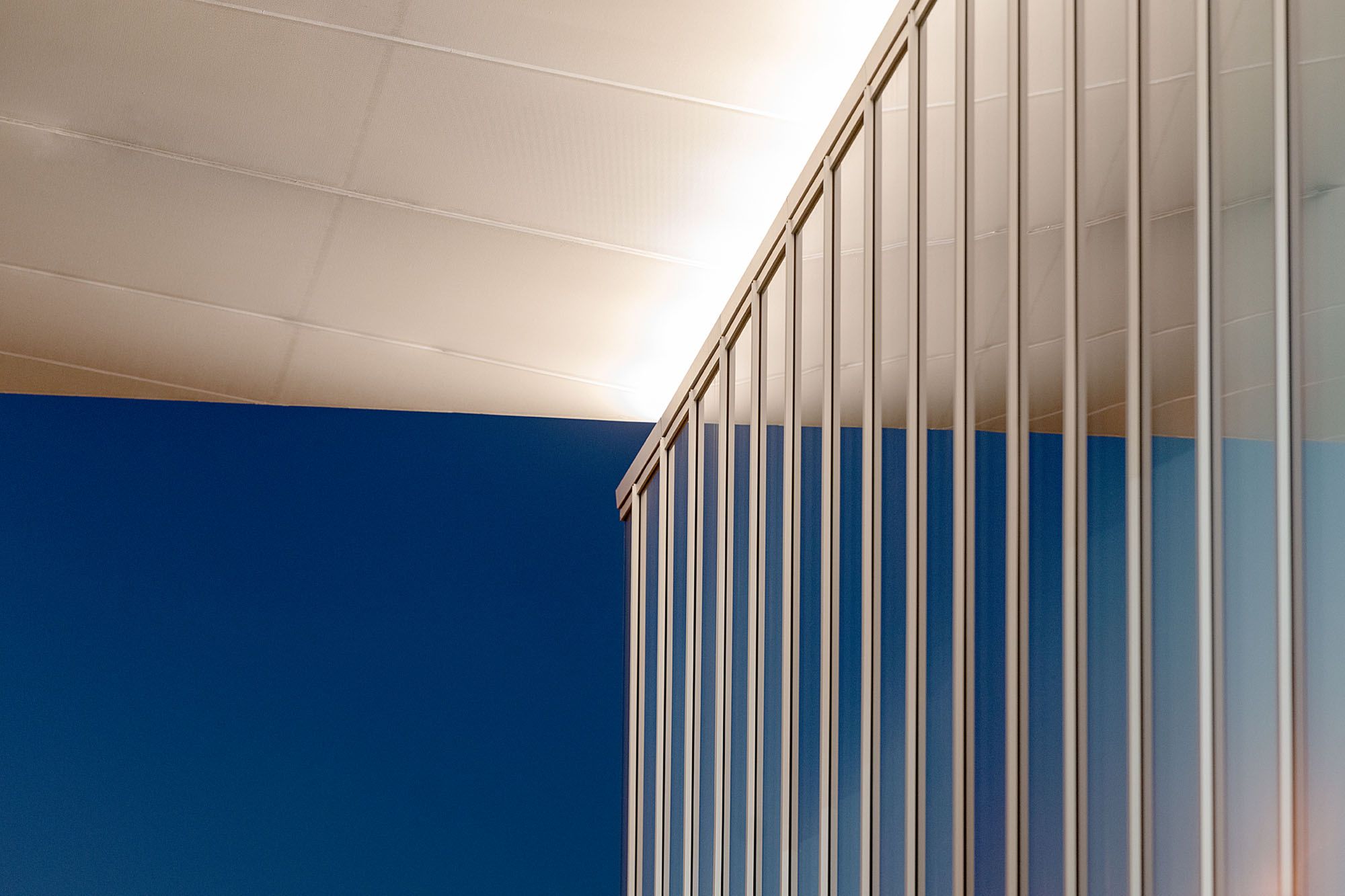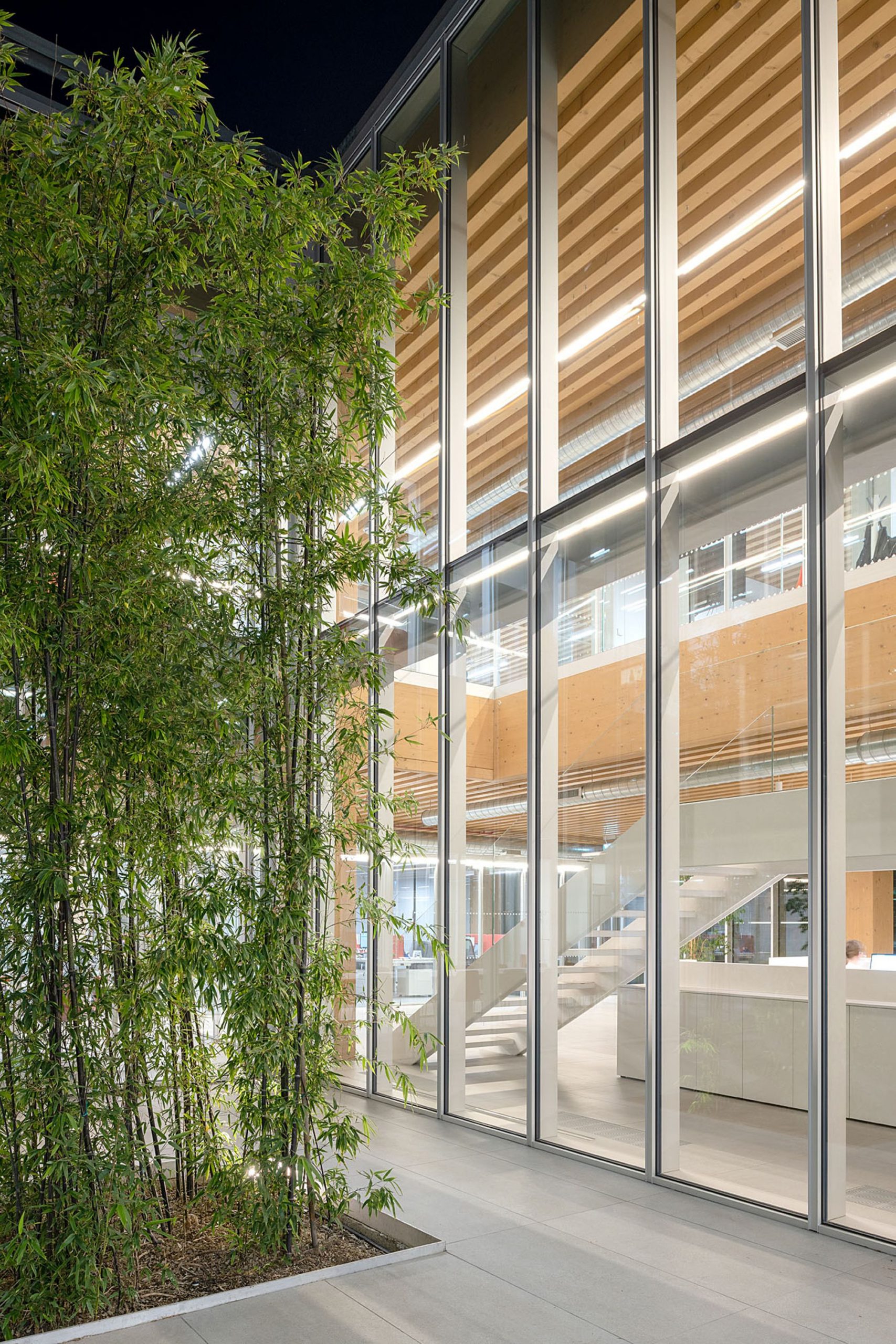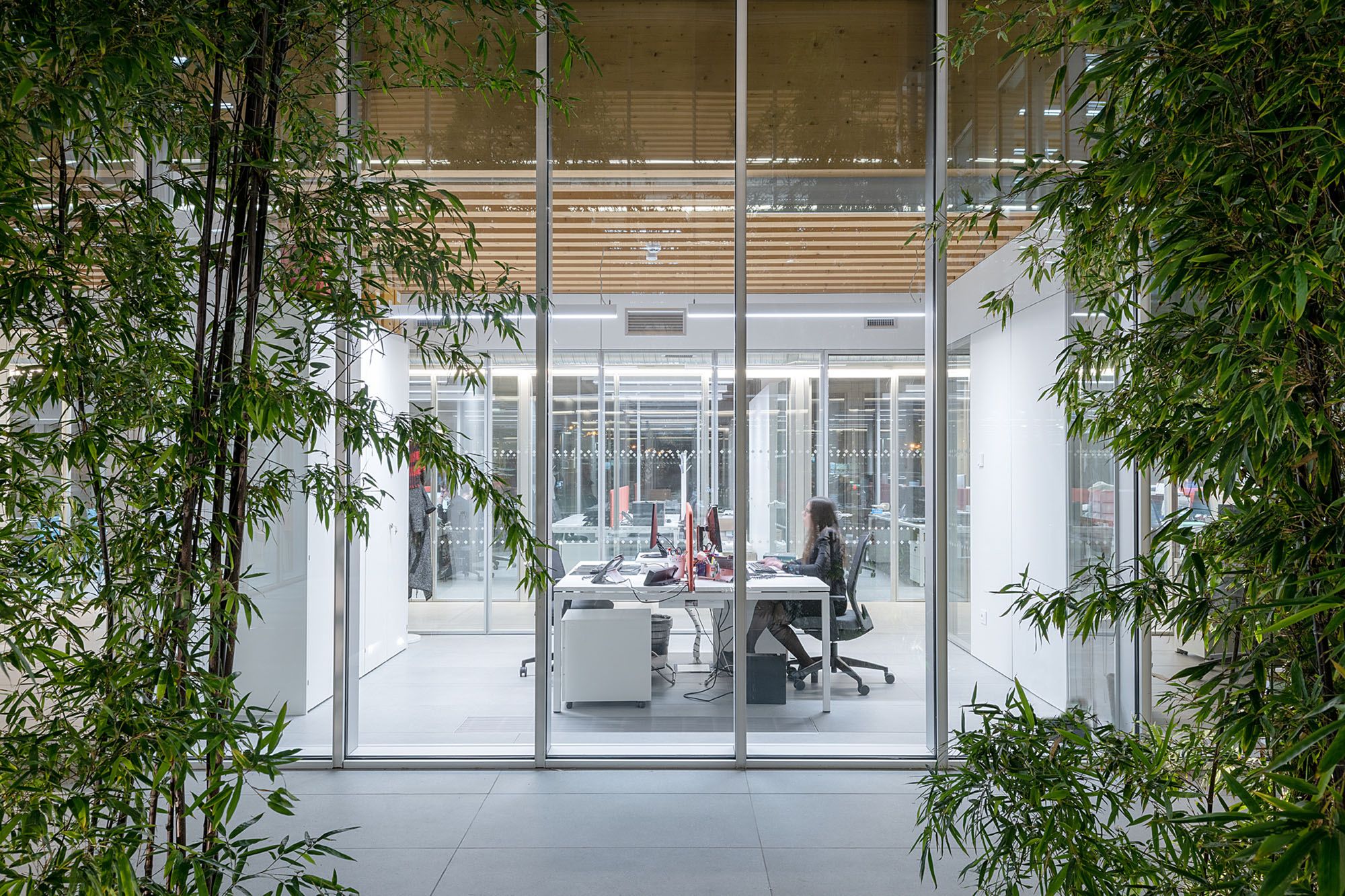 In order to better emphasize the wooden elements, the underlying parts of the floors of the ground floor and first floor are characterized by a succession of battens approximately 12 x 12 cm to create a repeated scan to embellish the office environments.