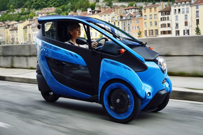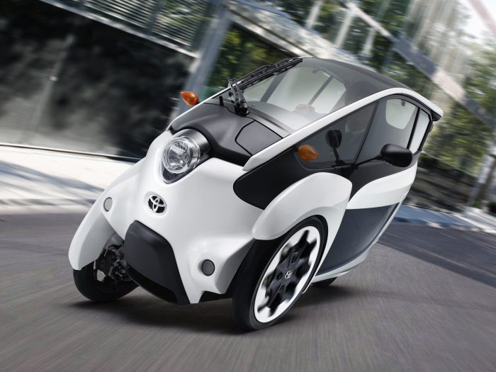 Toyota debuted its two person, all-electric, lithium-ion battery and pod –like i-road at the 2013 Geneva motor show. A single charge can take a person as far as 50 Km in a “safe, intuitive and enjoyable, helmet-free driving experience.”