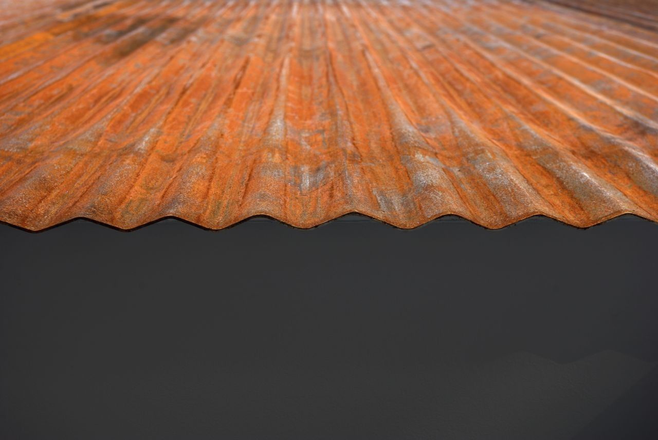The exterior is composed of panels of Cor-Ten aging steel, with ever-so-slightly recessed windows and entrances existing as subtractions or merely absences.  The panels are forged with ribs, giving stillness and a certain aesthetic with plays of changing shadow depths.