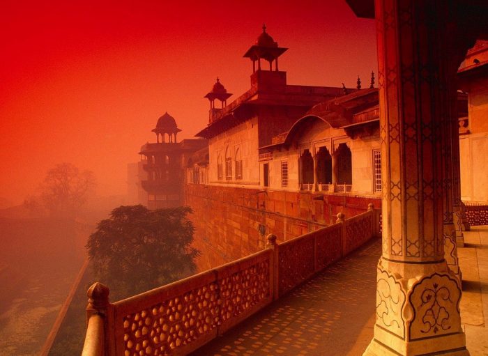 A substantial red sandstone fort on the Yamuna River’s banks in 1565 was constructed by the orders of Emperor Akbar. The fort was primarily constructed as a military fort, further built by his grandson Shah Jahan. It is a 1.5-mile-long, 70-foot-tall crescent-shaped tower with a ditch surrounding it. A 21.4 m high defensive wall surrounds the fort, which is semicircular. The fort has two entrances: the Amar Singh Gate (looking south) and the Delhi Gate (facing west), which was the fort’s original entrance.