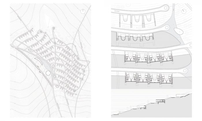 Vineyard and Hotel The next project is a facility that combines in itself the functions of the Vineyard and the Hotel, which result from a desire to activate the area (based on the phenomenon of the alternative tourism) and to use the grape vine cultivation tradition. The ramps, which are the extension of the trail, lead people in the observation deck, which offers a magnificent panoramic view into the inside the caldera, the volcano and the outside of the island. The whole refers to the terrain form – the view results from the topography, where the facility is located. On one hand the form is slightly raised above the ground level, forming a horizontal block, on the other hand, it is embedded in the rocky slope of the rising caldera. The central part was designed to be a generally accessible square. This solution allowed the consistent combination of the two functions.