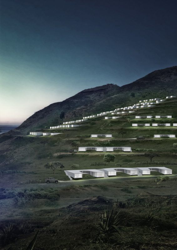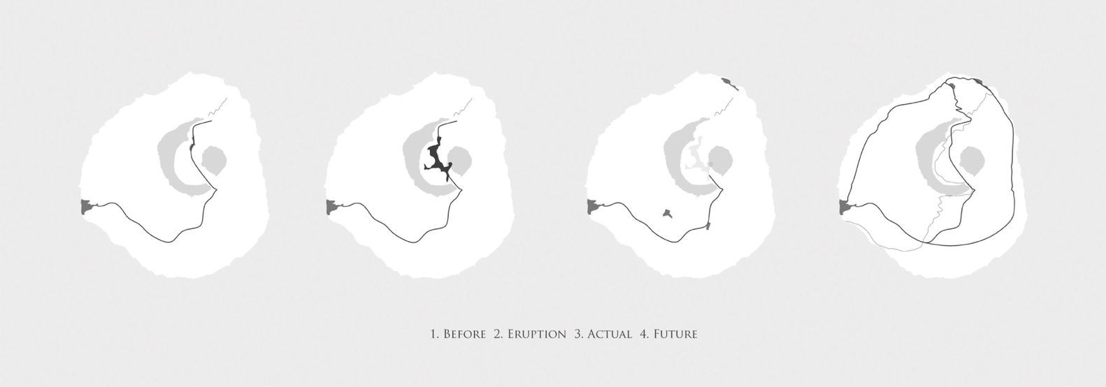 New village The last of undertaken interventions is building a new village – creating a place which the community, separated by the volcano, could once again inhabit. The village was located near the new northern road to caldera. In order to minimise the impact of the road on the living conditions in the village, the park, which adjoins the main square of the village, has been designed. In its vicinity have been located the most important facilities such as a school, a market and a church. The whole is complemented by a network of alleys, irrigation canals and theme pavilions. Based on the natural terrain and the layout of the streets, the houses have been designed as cascaded, composed into the hillside buildings. The space behind the houses has been used as a place that could serve as orchards or vegetable gardens, on which residents could produce their own products.