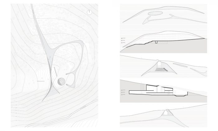 Only when one approaches closer, a slight cut in the caldera starts to emerge. The entire cubature has been hidden underground. An important element is the public area which not only makes up for the entrance to the interior, but also serves as a multifunctional square. Along with high glazing on the sides and slotted roof above, it frames the views for the volcano located precisely on the axis.
