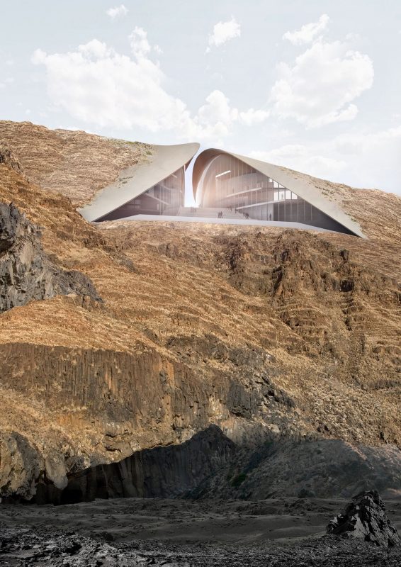 Volcanism and Culture Centre The first one is the Centre of Culture and Volcanism. The project is a continuation of the activity of the facility destroyed during the eruption. The chosen location is on the border of two entirely different landscapes. Noticing the unusual nature contrast has awakened my imagination and became the starting point for the designed architecture. The project was treated as an opportunity to create a “connection” between the inside and outside of the island. The building seems invisible from a distance.