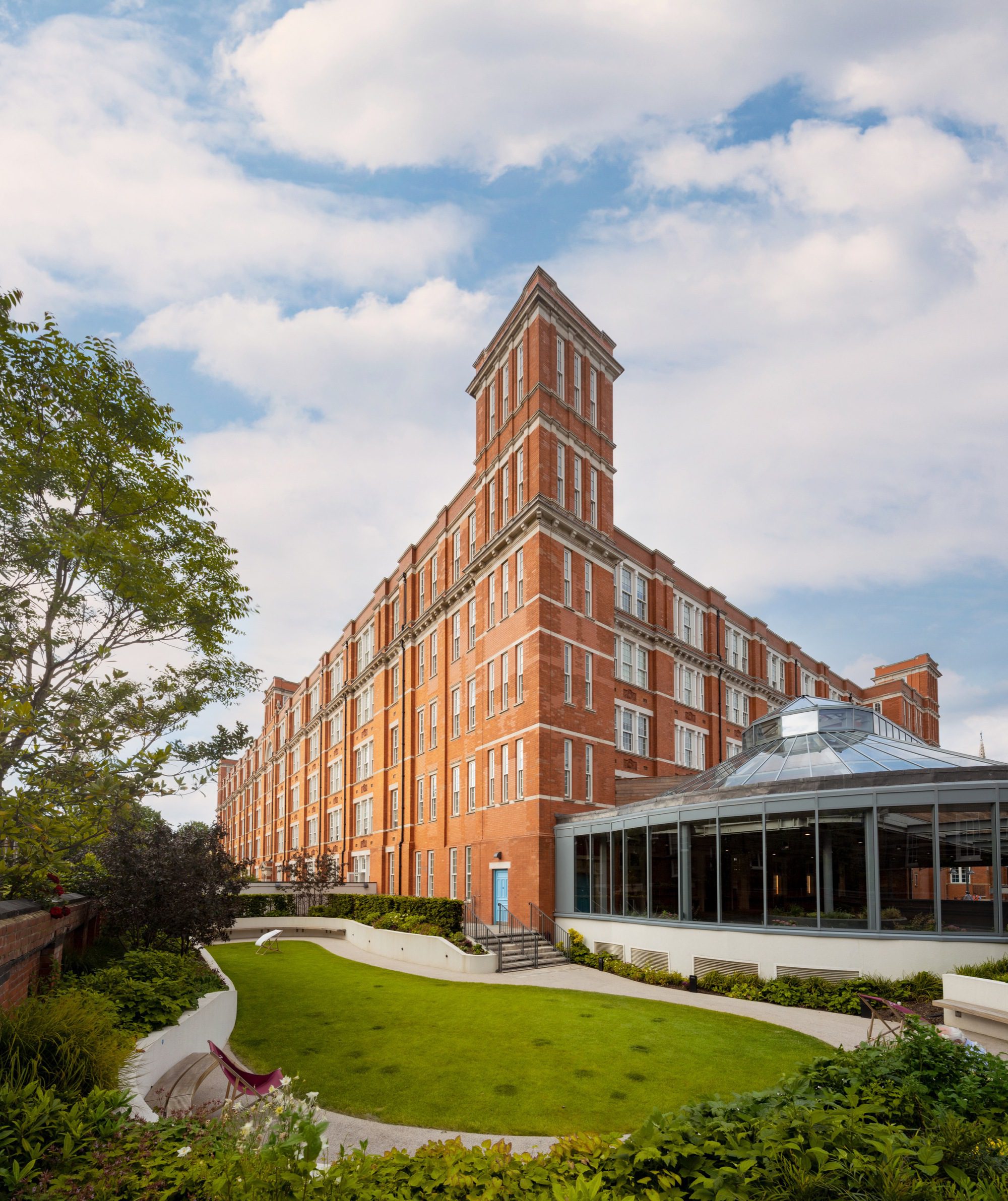 The principal building to the west provides large loft-style apartments that celebrate the building’s original Edwardian baroque features, including high ceilings, tall sash windows, and ornate external detailing. Carefully integrated are 108 studio and 1-bedroom serviced apartments and communal facilities including the breakfast room and residents lounge, business facilities, laundrette, and fitness center. Above, an additional floor of penthouses each has access to roof gardens, individual pools, and views over the skyline.