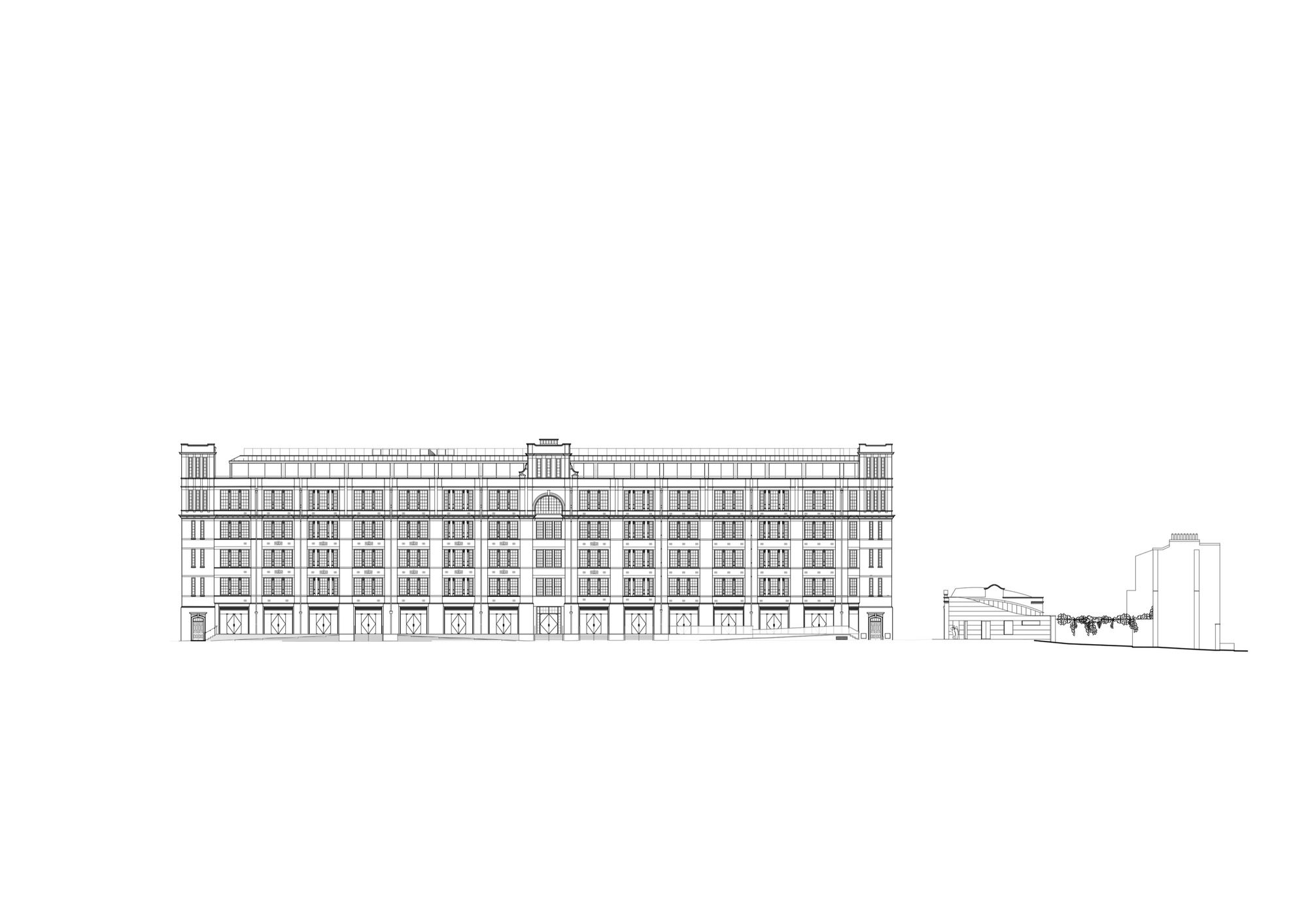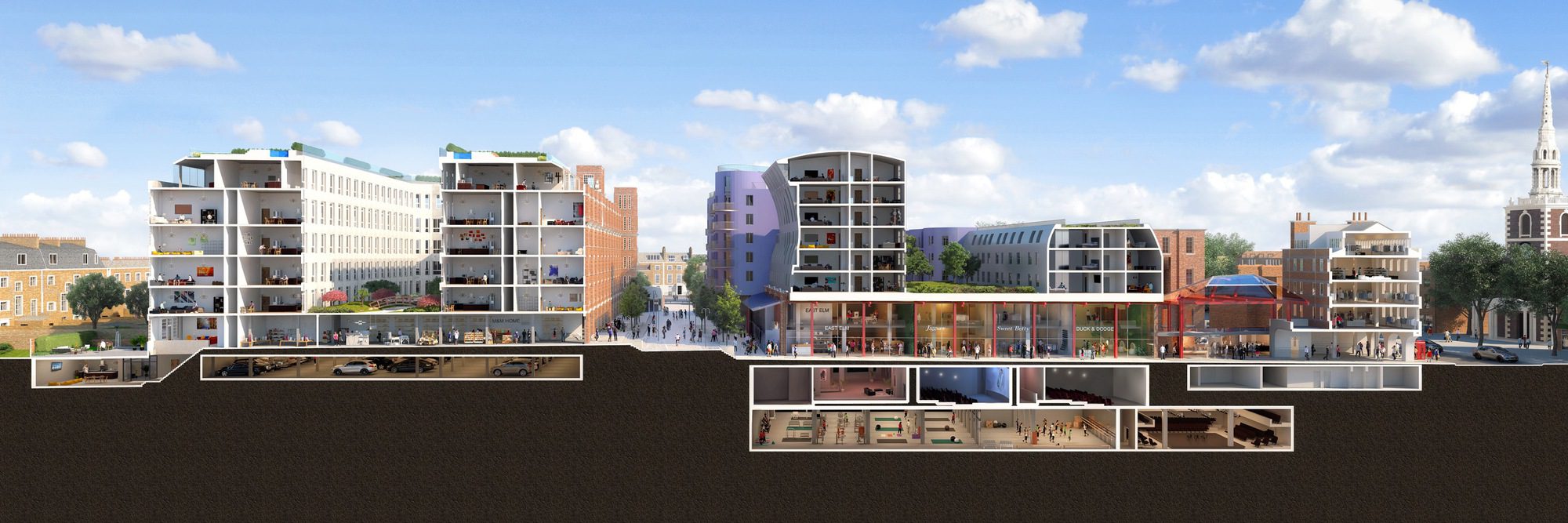 A new six-story building to the north shares a central amenity courtyard garden with a series of sweeping curved façades and balconies. Triple basements house a large cinema complex, a huge gymnasium, and two theatre spaces to compliment the retail and cafés of the ground and mezzanine areas. CZWG was commissioned by Sager to develop a master plan in 2003, securing planning and listed building consent in 2005, amended in 2013 under Section 73.