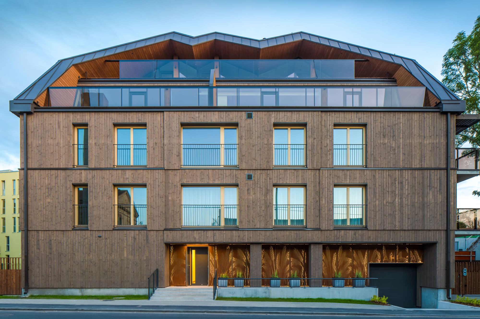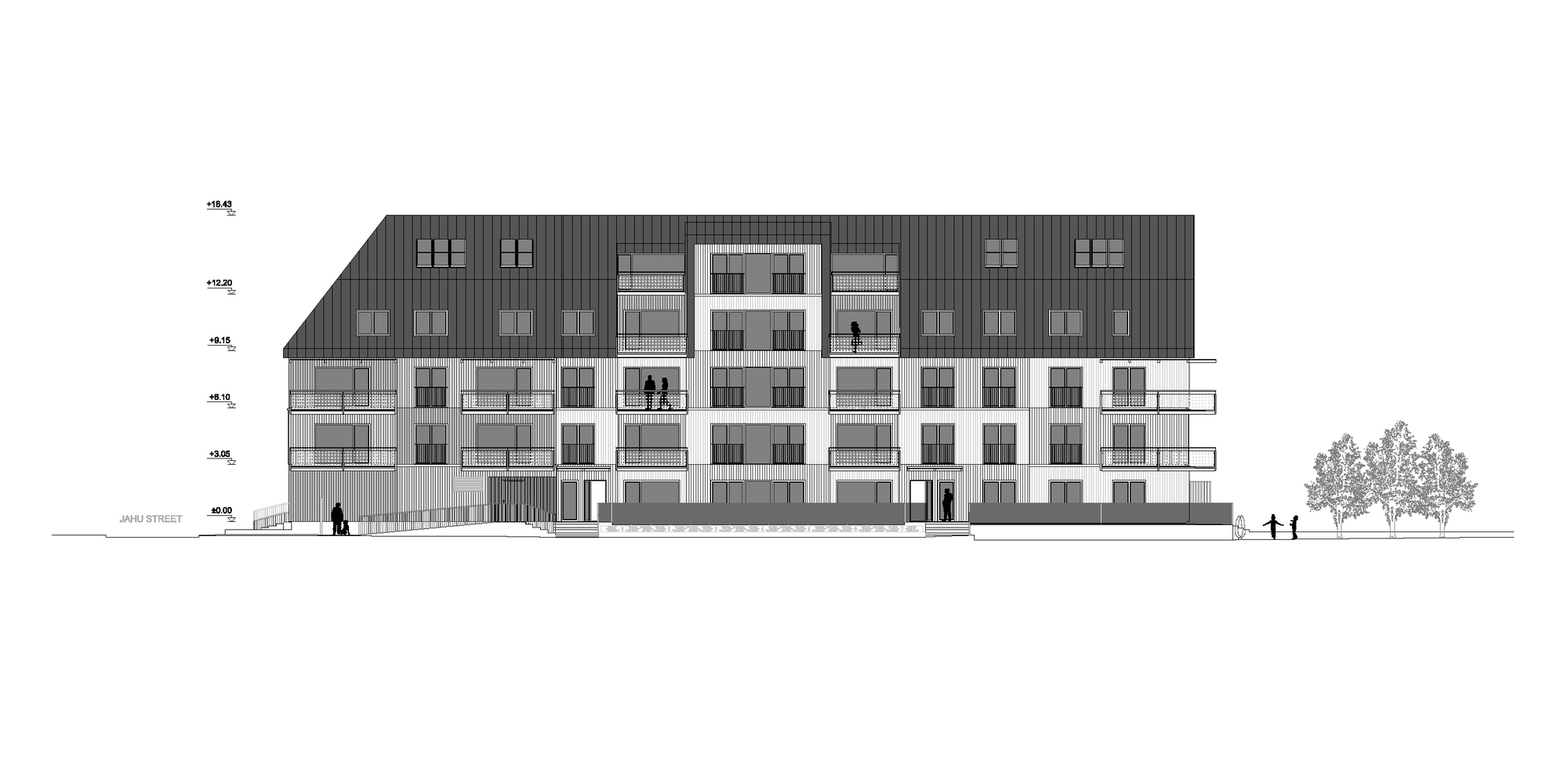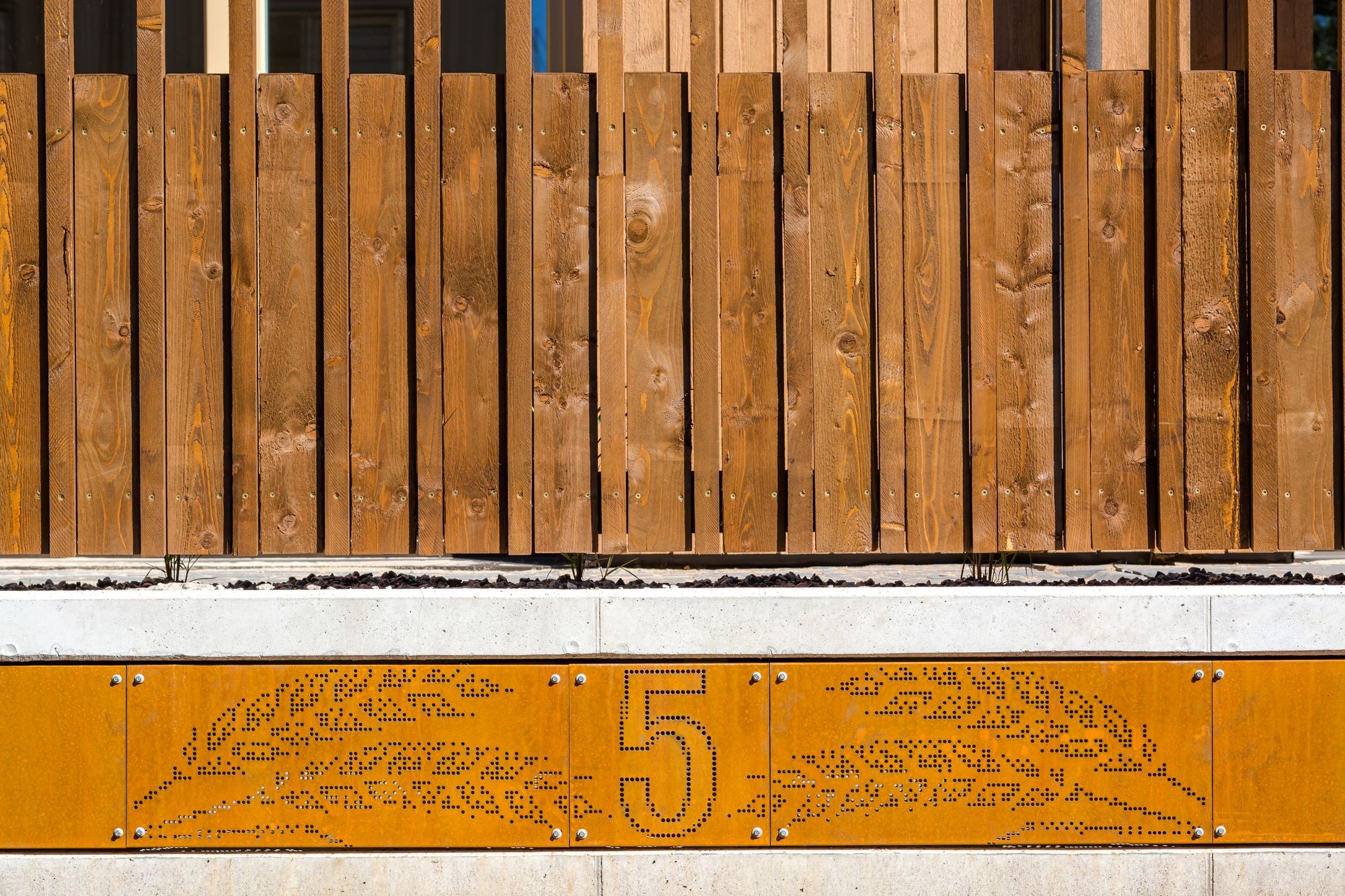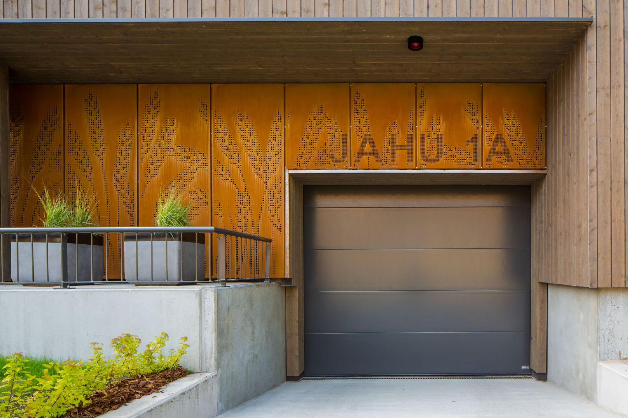 Facades are covered with Siberian larch – street side block of the house is darker and the courtyard part is kept in natural colour of the wood. Facade on the ground floor at Jahu street is covered with art perforated Liberta Cor-Ten 700 TM cassettes that have a special design for this building. Same perforated panels are used for the parking lot signs and in the pergola of the common garden. The crops on the panels refer to the street name Jahu that means flour. At the end of the 19th century there used to be a flour warehouse on this street, hence the name.