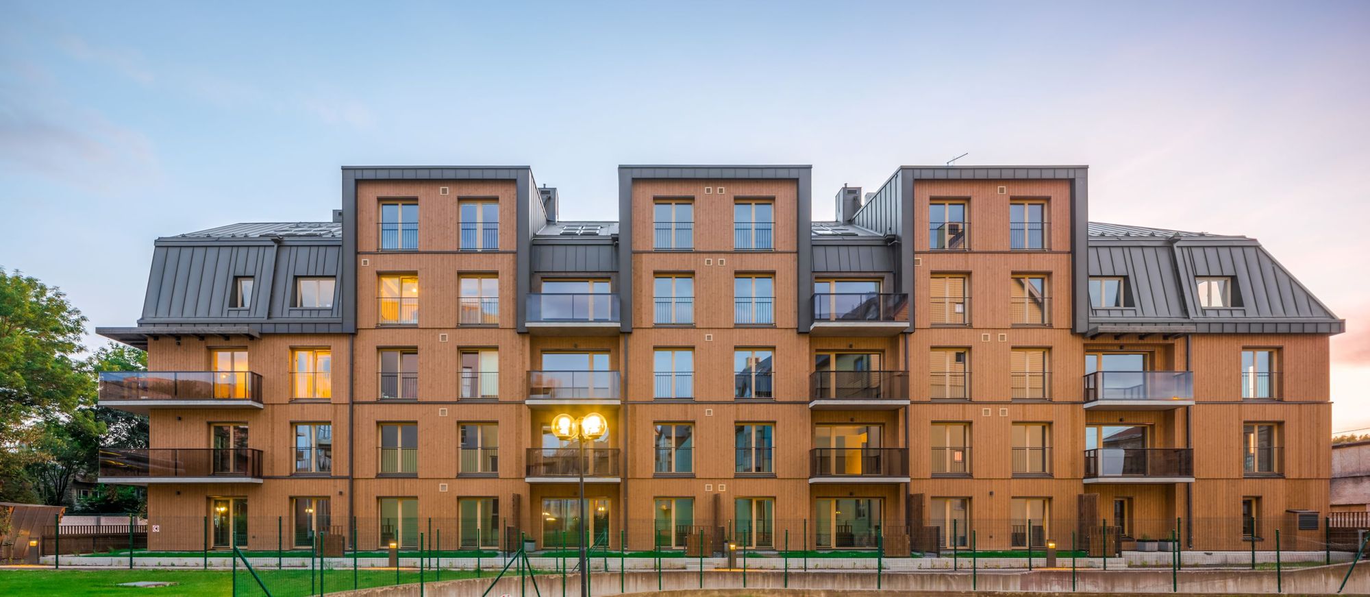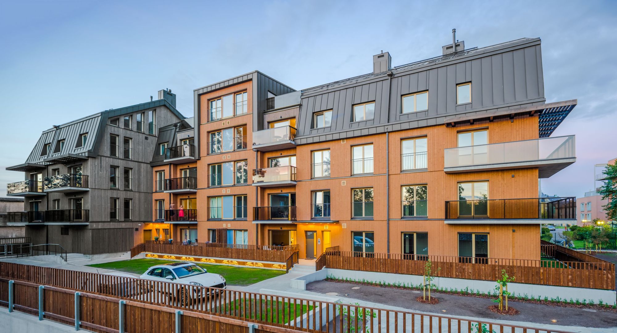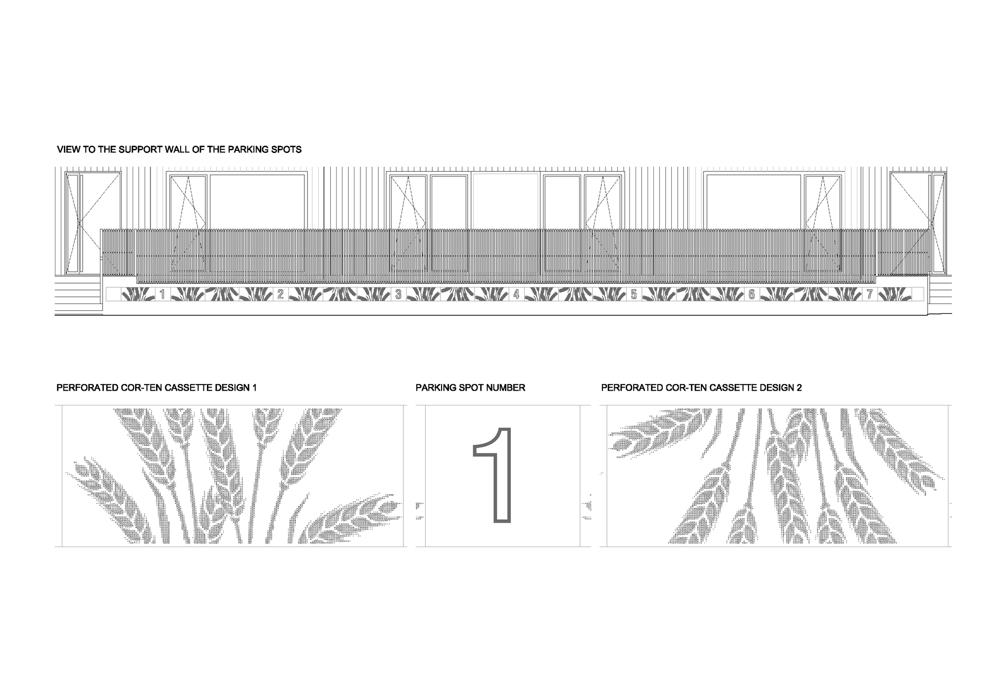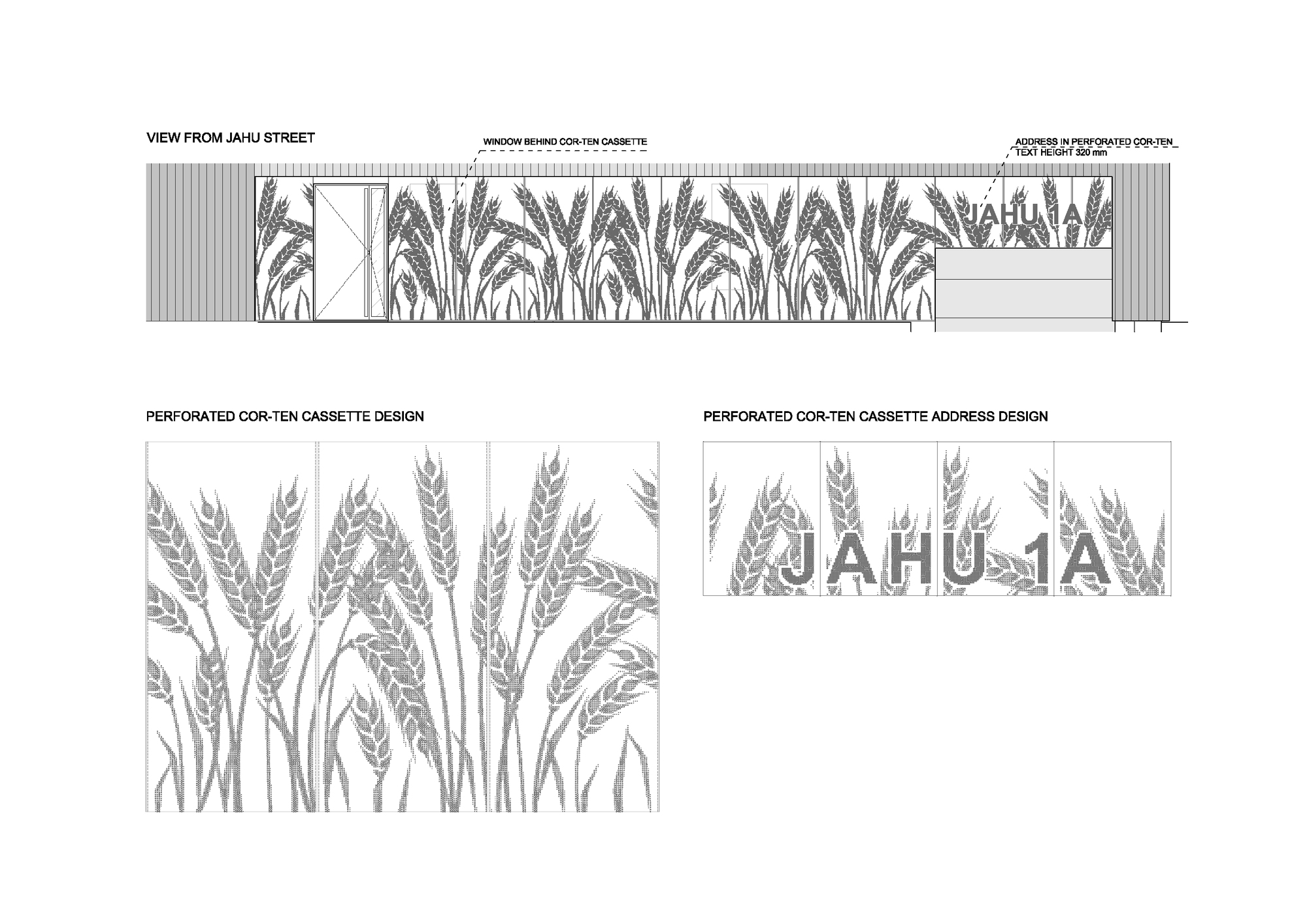 Facades are covered with Siberian larch – street side block of the house is darker and the courtyard part is kept in natural colour of the wood. Facade on the ground floor at Jahu street is covered with art perforated Liberta Cor-Ten 700 TM cassettes that have a special design for this building. Same perforated panels are used for the parking lot signs and in the pergola of the common garden. The crops on the panels refer to the street name Jahu that means flour. At the end of the 19th century there used to be a flour warehouse on this street, hence the name.