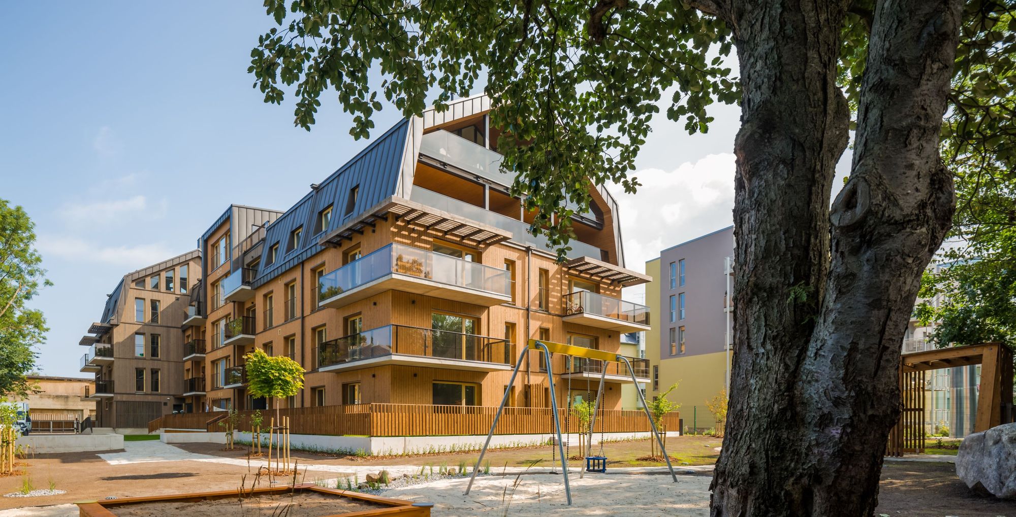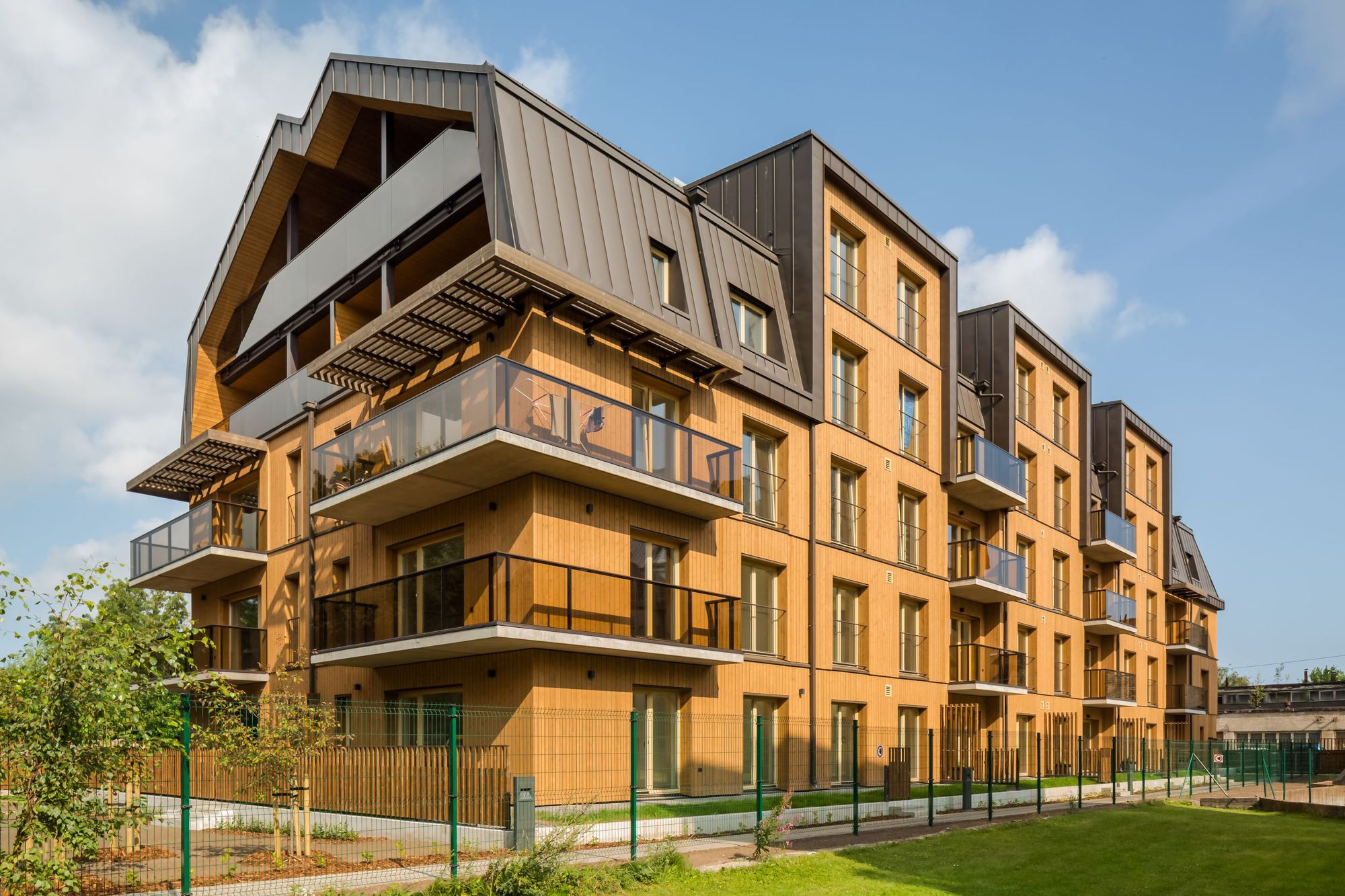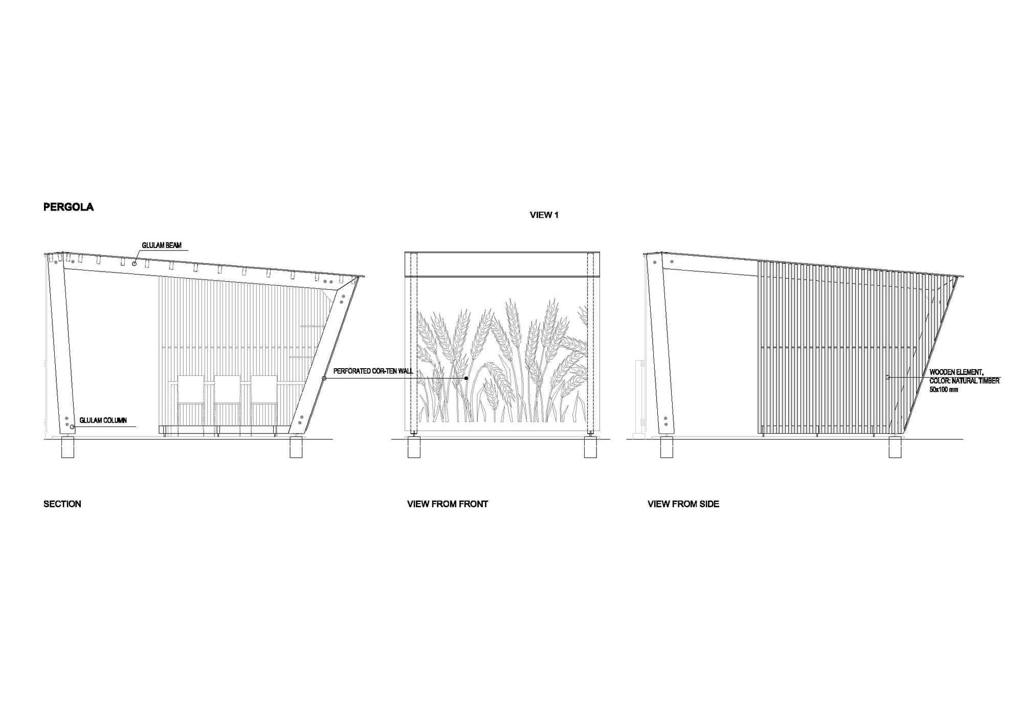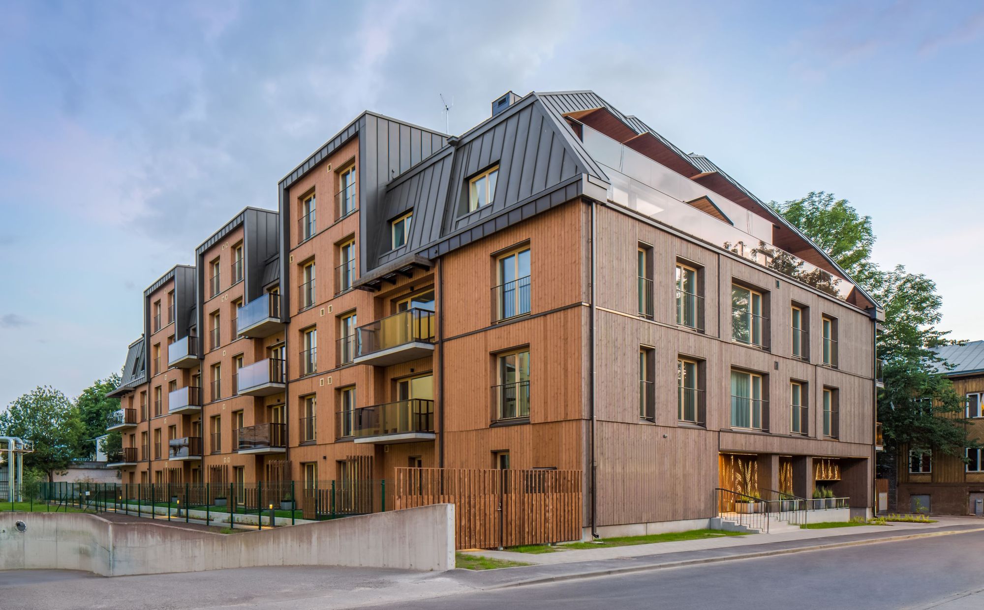 Facades are covered with Siberian larch – street side block of the house is darker and the courtyard part is kept in natural colour of the wood. Facade on the ground floor at Jahu street is covered with art perforated Liberta Cor-Ten 700 TM cassettes that have a special design for this building. Same perforated panels are used for the parking lot signs and in the pergola of the common garden. The crops on the panels refer to the street name Jahu that means flour. At the end of the 19th century there used to be a flour warehouse on this street, hence the name.