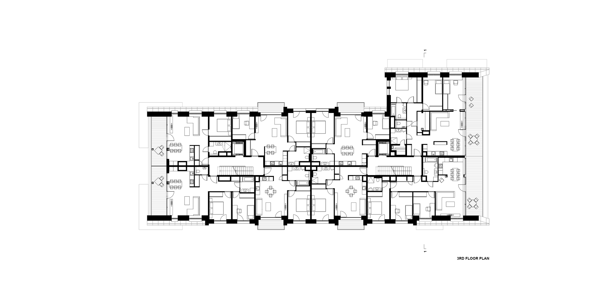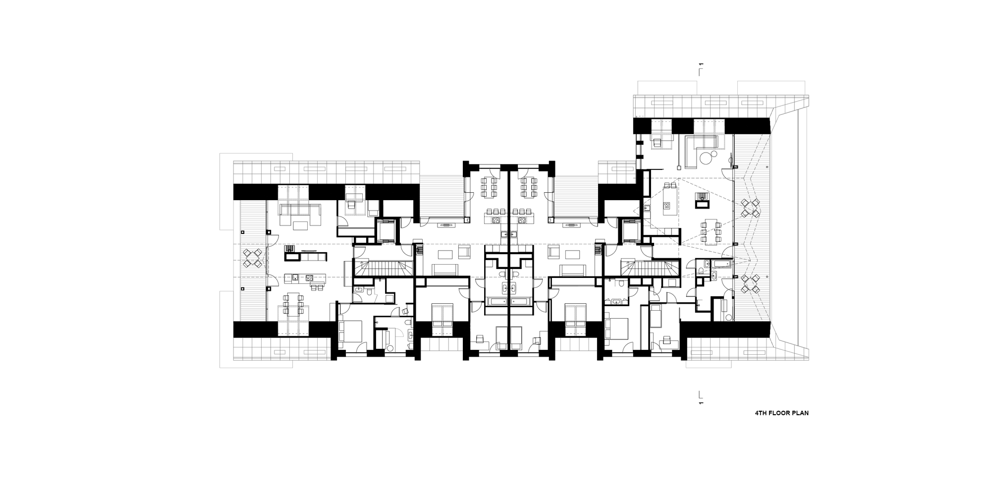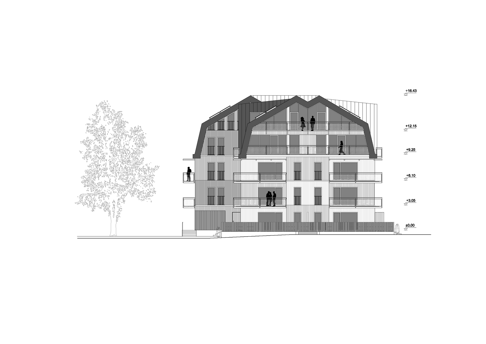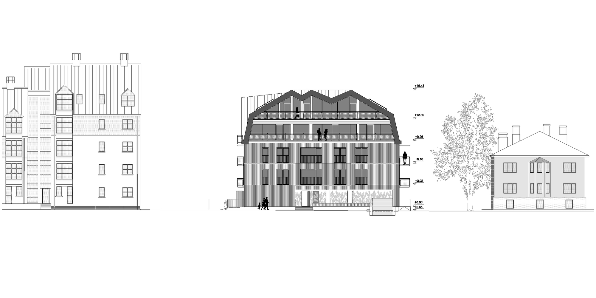 The architectural form of this building is inspired by the historical Kalamaja houses. The shape of the roof refers to the roofscapes of the neighbouring historical wooden houses –the angles of roof slopes and the dormers of the last floor apartments. To blend this 5-storey building into an area with mostly 3-storey houses, a slope starting from the 3rd floor cuts back the upper floors on the street side. It also creates roof terraces with a sea view for the apartments.
