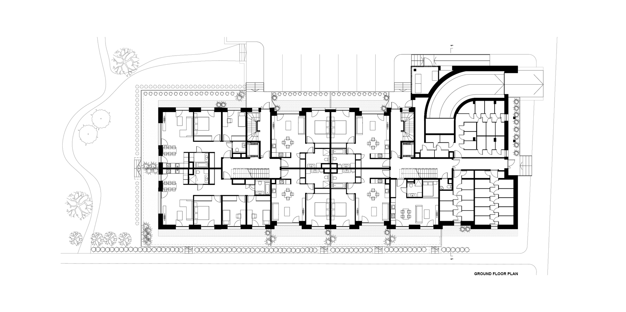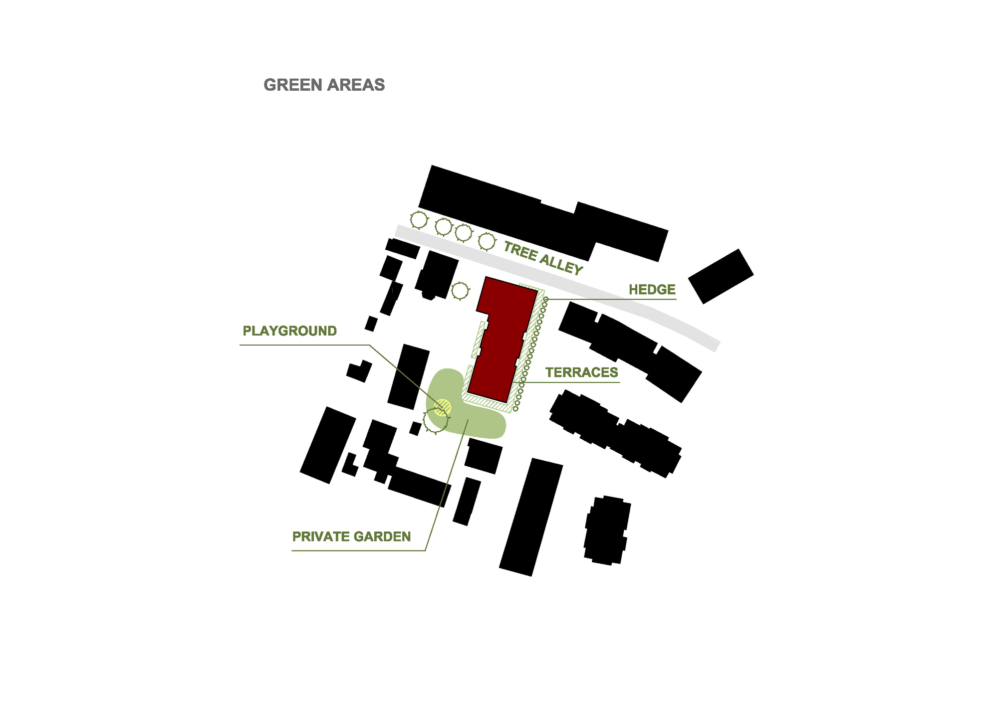 Taking the plot into account, a 5-storey building with 37 apartments was designed. With a footprint of 840 m2, the building is situated in accordance with existing valuable trees and at the same time creates a south-facing garden with lilacs, apple- and cherry trees. This kind of gardens are characteristic for the historic Kalamaja courtyards. The flats on the ground floor have terraces with small gardens in front of them to separate them from public areas and give more privacy to the inhabitants.