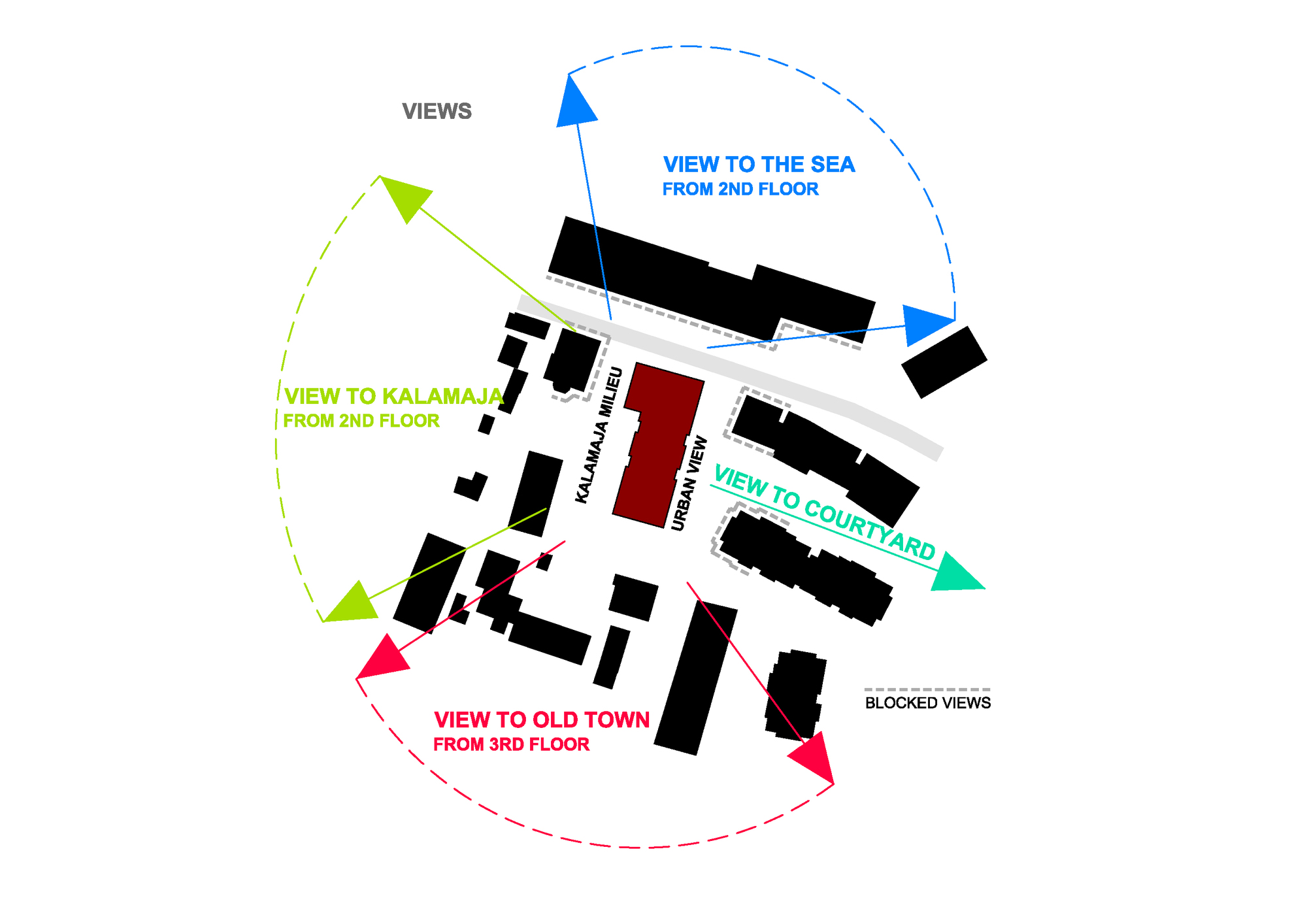 Starting from the 2nd floor, apartments facing north have a view to the sea and flats to west have a nice overview of Kalamaja. From the 3rd floor all the apartments to south are looking to the medieval old town of Tallinn. Flats to the east see the modern face of the city with its urban courtyards.