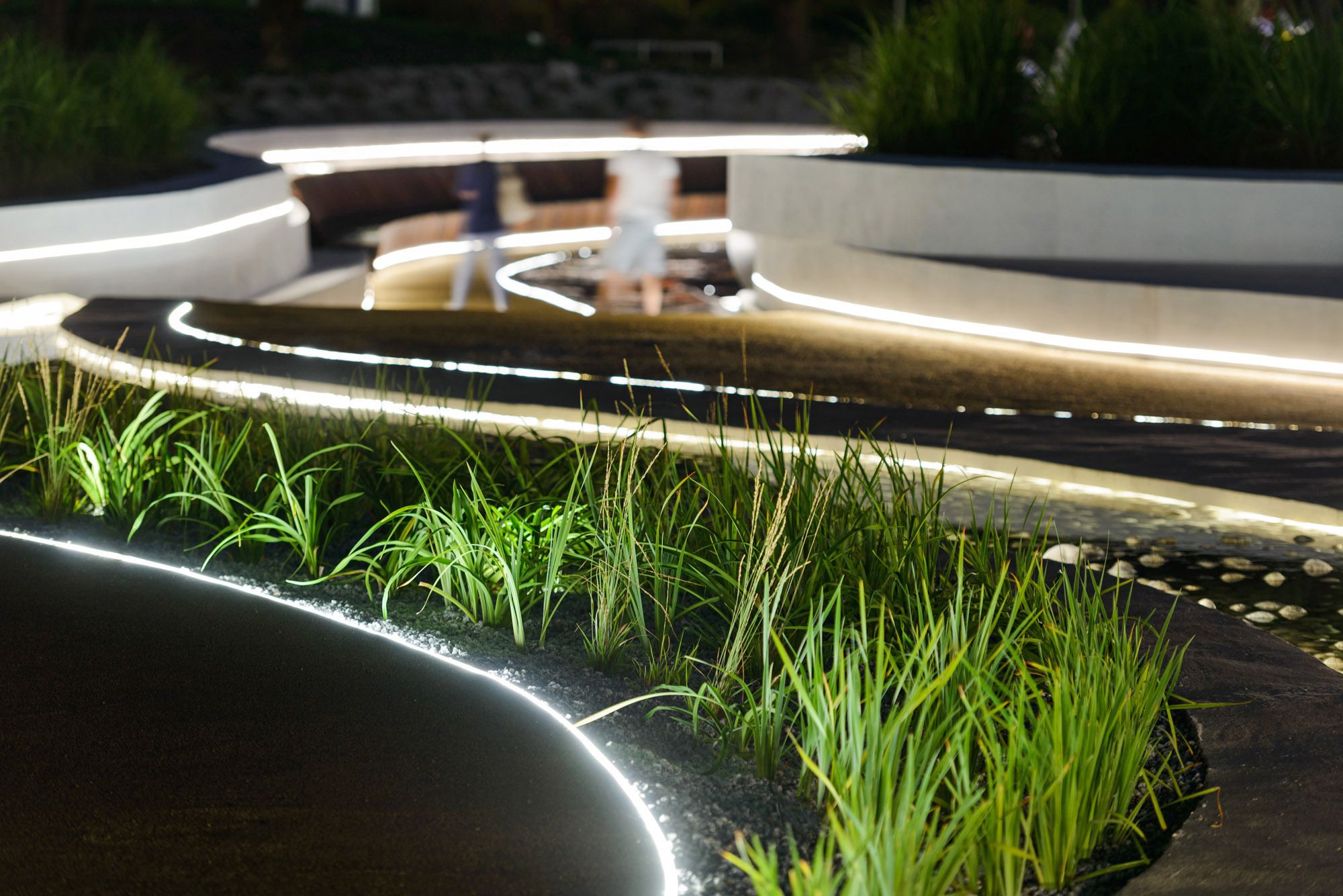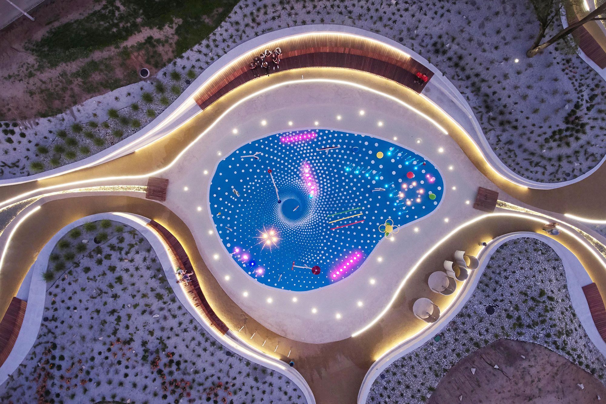 A playground is entwined with a shallow stream, acting as a footbath pool. Floors pattern refers to spilling water and makes a background for colorful water toys. Around the water playground, there are benches and seats for parents. That helps them taking care for their playing children.