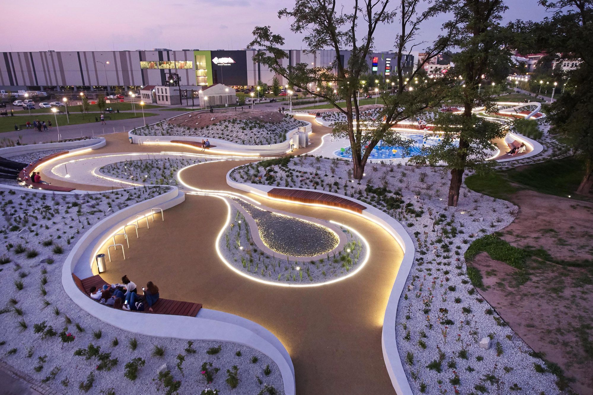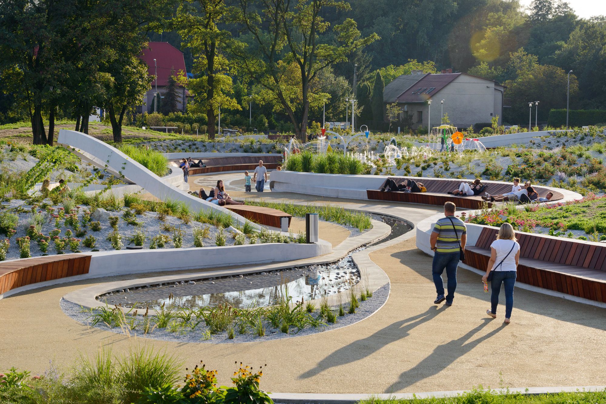 Designed by RS+ Robert Skitek, The project included designing of water playground with public greeneries land at the former coal mine terrains. The plan sets up a group of rounded plazas merging with greenery and connected with streams flowing down to the central part. The water playground is situated in the focal point, surrounded by green hills. It is recessed in regard to the surrounding alleys level. It makes a comfortable situation for little users, not being visible to walkers from the main alley.