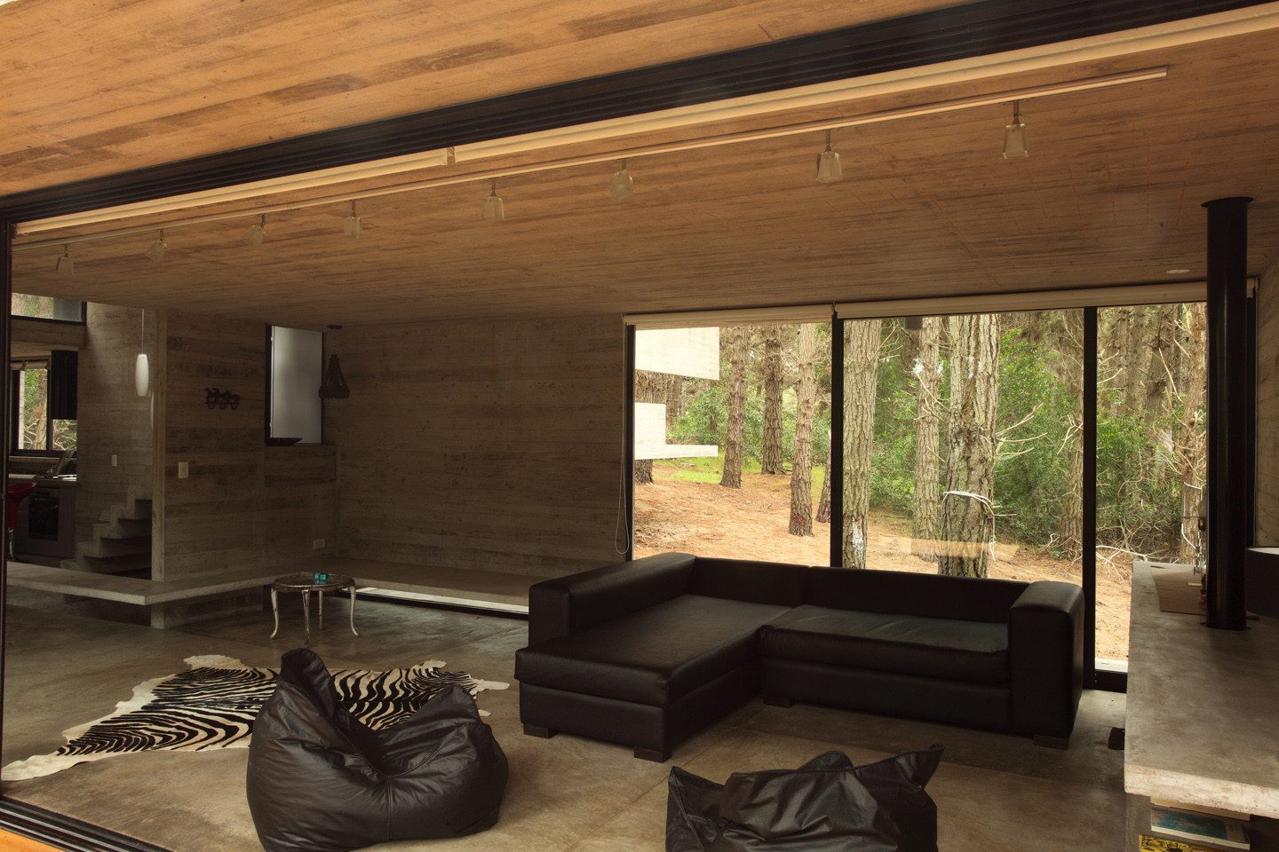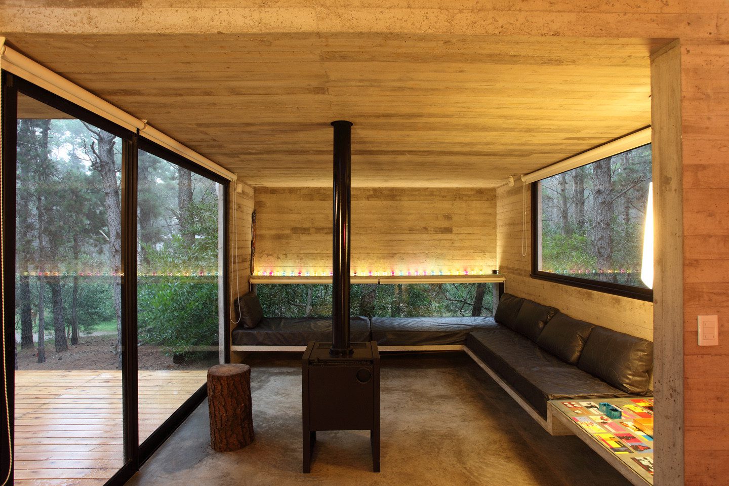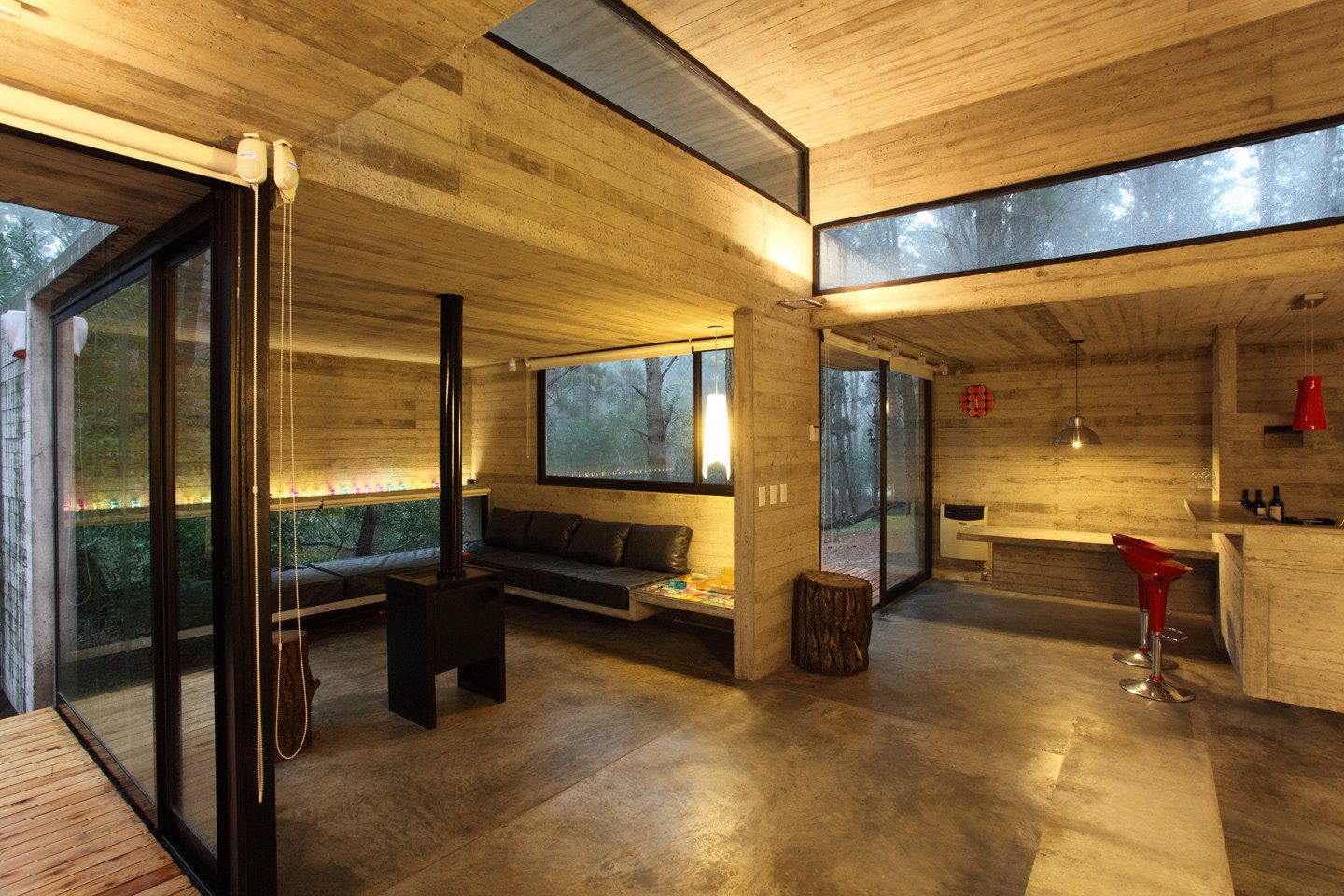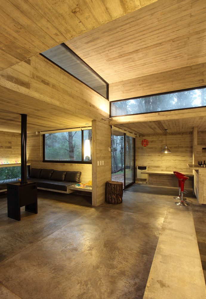 The three basic materials of the house are exposed concrete, glass, and wood, as well as the natural decorative elements of the surrounding forest. H21 concrete was used with the addition of a plasticizer to the mix with little amounts of water used to harden, resulting in a very compact material that does not require sealing. The few hollow brick interior walls are finished in smoothing cement. The heating system, since there is no natural gas in the area, was resolved with a system that combines salamander, bottled gas stoves and electric heaters.
