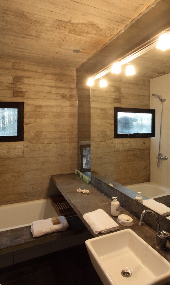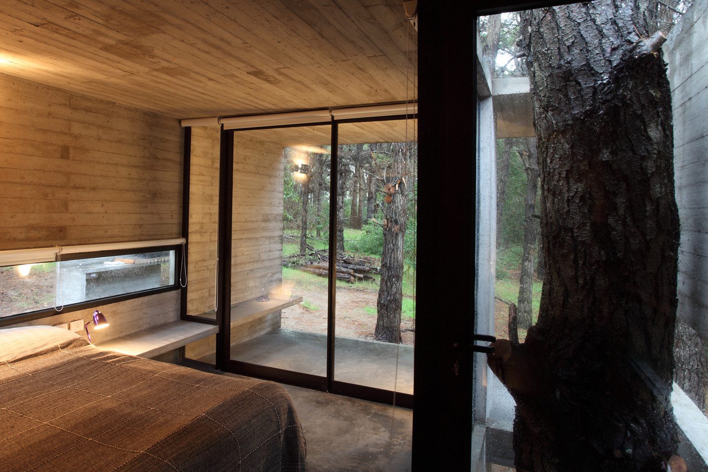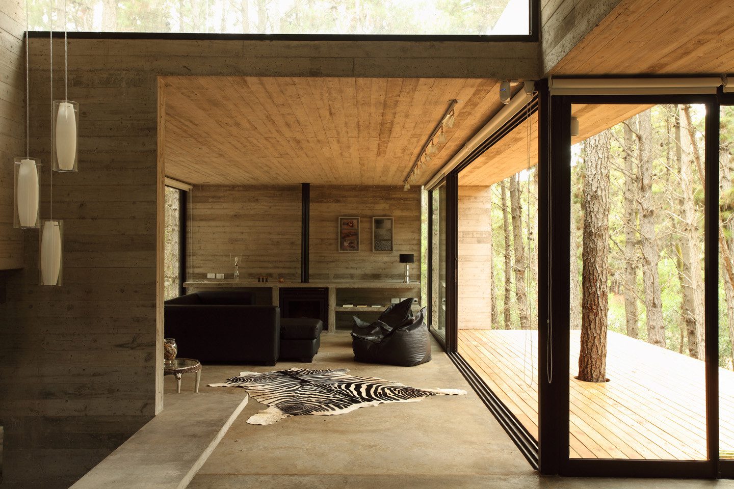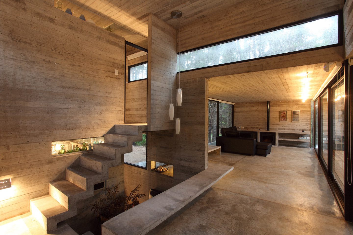 The three basic materials of the house are exposed concrete, glass, and wood, as well as the natural decorative elements of the surrounding forest. H21 concrete was used with the addition of a plasticizer to the mix with little amounts of water used to harden, resulting in a very compact material that does not require sealing. The few hollow brick interior walls are finished in smoothing cement. The heating system, since there is no natural gas in the area, was resolved with a system that combines salamander, bottled gas stoves and electric heaters.