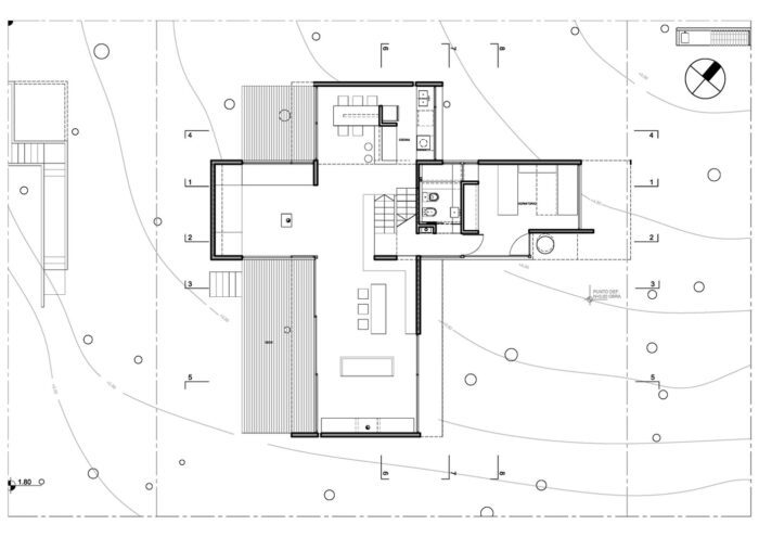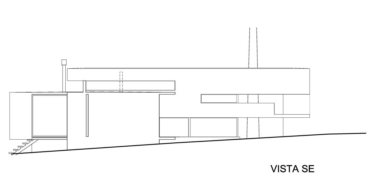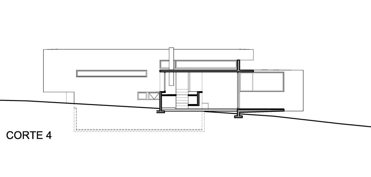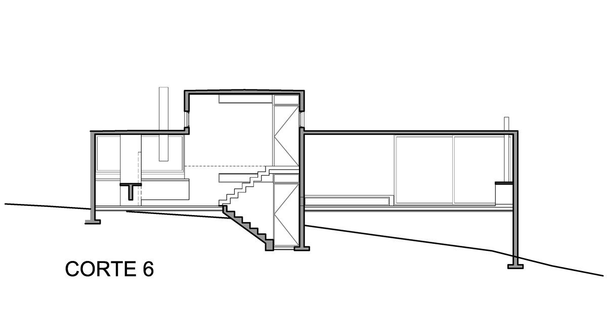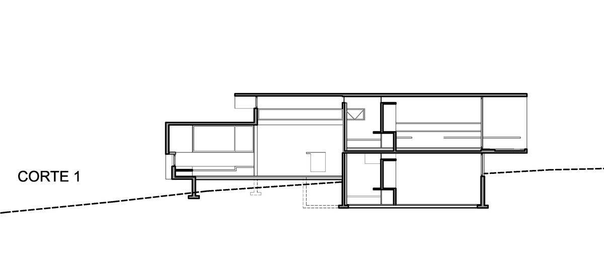 The house was conceived as two pure prisms, located in a clearing among trees of various heights, as intersecting perpendicular forms that joined at half levels. The slope was once again used to the advantage of the proposal to hide parts of the program, thereby reducing the presence of the building on the site. The form that developed from the conjoining of the volumes resulted in programs that were substantially independent of one another, but united through large openings in the social gathering spaces as well as through outdoor terraces and wooden decks that extended the living space out into the forest.