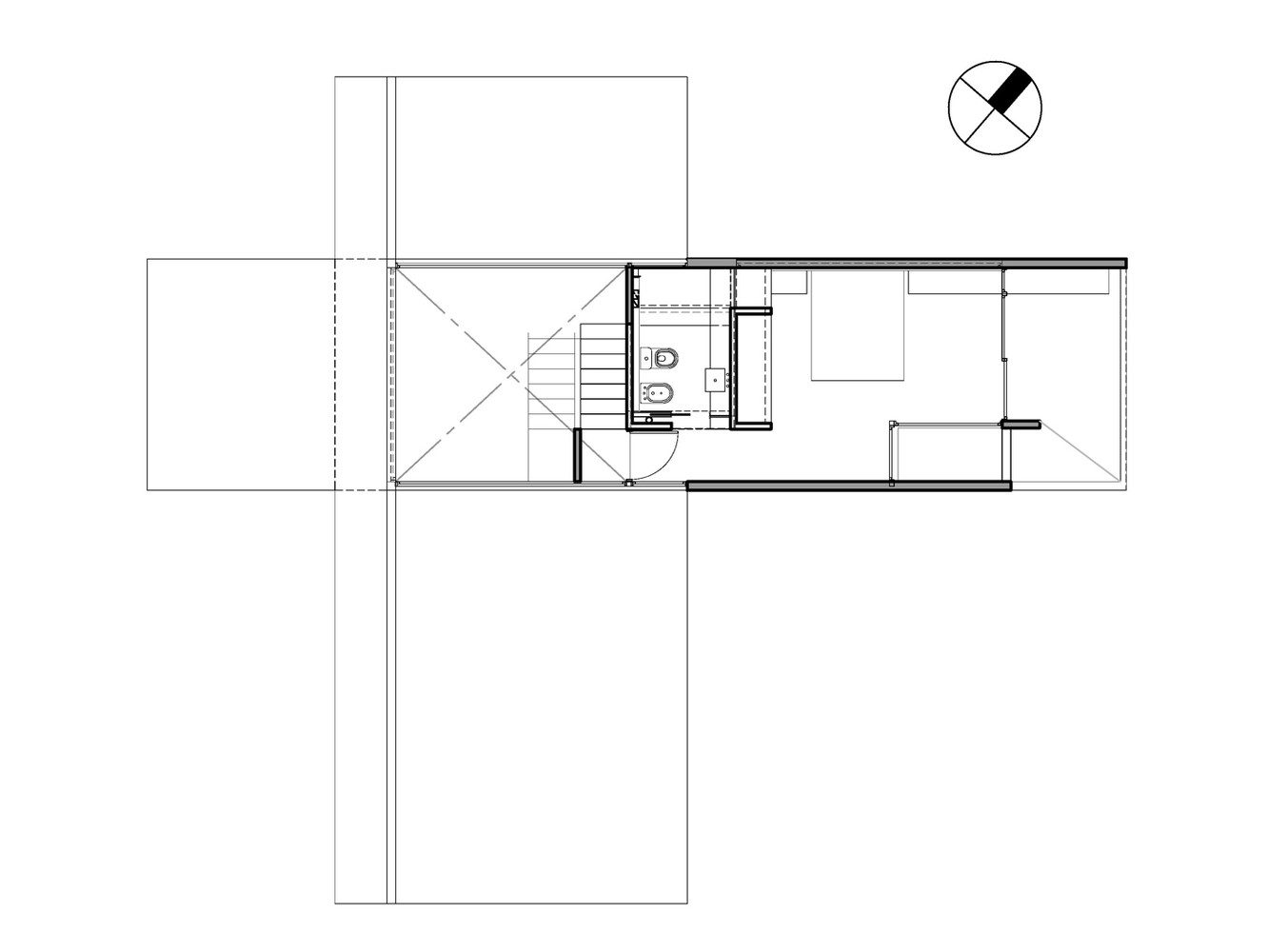 The house is accessed along the longest side through a deck that is raised above the natural terrain. By stepping the deck into a complete volume of the house and creating a corner as the entrance, BAK Architects simulated an interior condition in the exterior of the residence, where already the material and spatial organization is felt. The height difference perceived in the entry intentionally signify the different uses of the spaces caused by the intersections of the prisms.