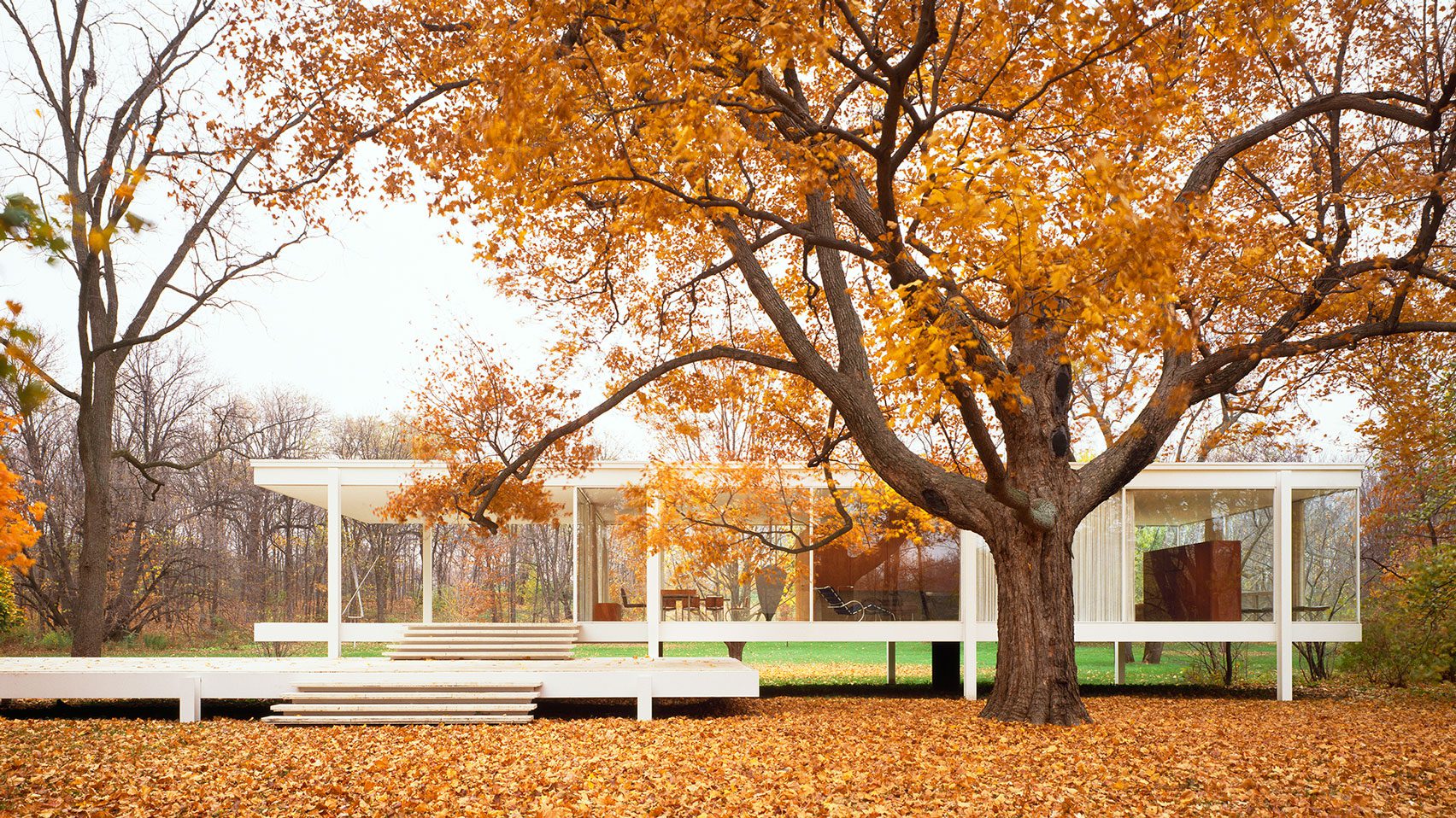 Farnsworth House is located on a 62-acre site with a breath-taking natural landscape. Mies Van der Rohe designed the house to be a weekend retreat for his client, Chicago nephrologist Edith Farnsworth. He explained his design concept for the house by saying: “Nature, too, shall live its own life. We must beware not to disrupt it with the color of our houses and interior fittings. Yet we should attempt to bring nature, houses, and human beings together into a higher unity.” So, he optimized the view of the relaxing forest-like surroundings of the house by enveloping the structure, which is mainly composed of horizontal slabs and steel columns, in floor-to-ceiling glass. The all glass skin provides an enchanting panoramic view of nature and lets visitors see through the house, not obstructed by the man-made element.