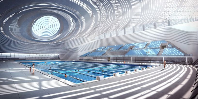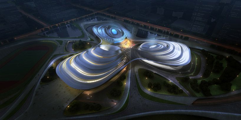 Chinese firm DUO, in accordance with China National Sports Group have jointly collaborated to create the masterplan, which measures 1,800 x 1,540 feet (550 by 470 meter). The tri-fold arrangement includes a gymnasium, aquatic facility and training center, which have all been linked with a roof canopy that wraps around the whole perimeter of the building.