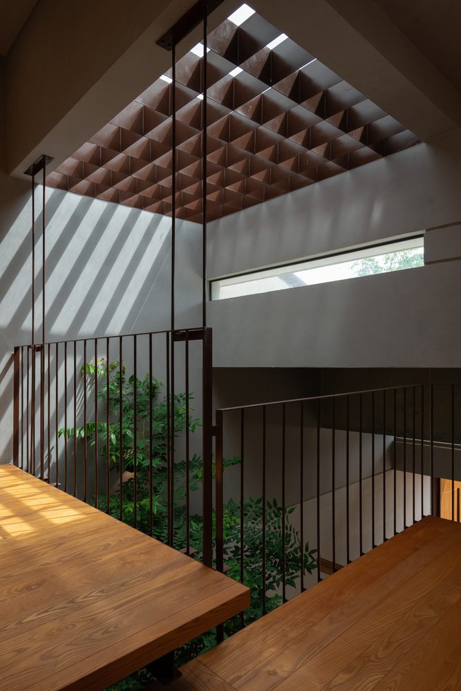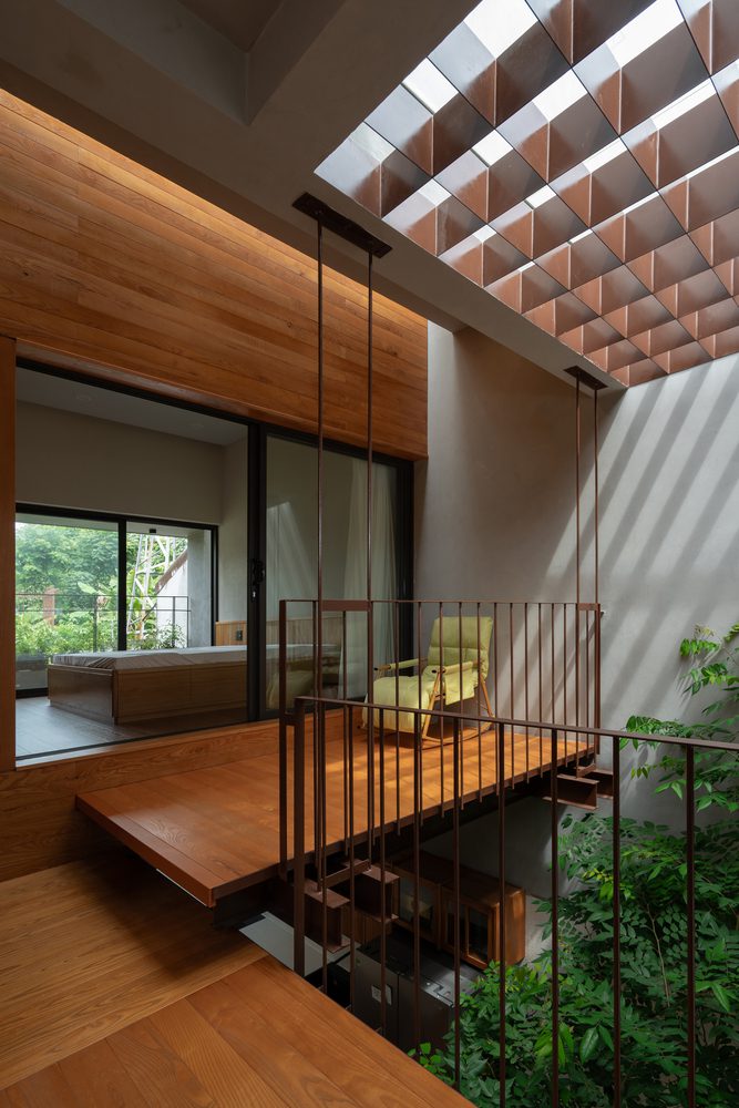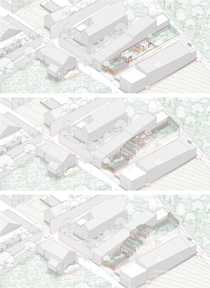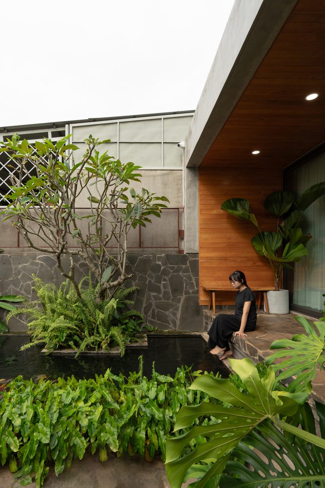 2. Transitional spaces: Inside / In-between / Outside – The house applies both “inside-out” and “outside-in” design strategies to connect interior and exterior spaces through multiple layers of architecture and landscape. This approach adds spatial depth and softens the boundary between indoor and outdoor areas, creating an experience similar to a slow, continuous walk. The use of landscape materials within interior spaces also helps blend the building with nature.