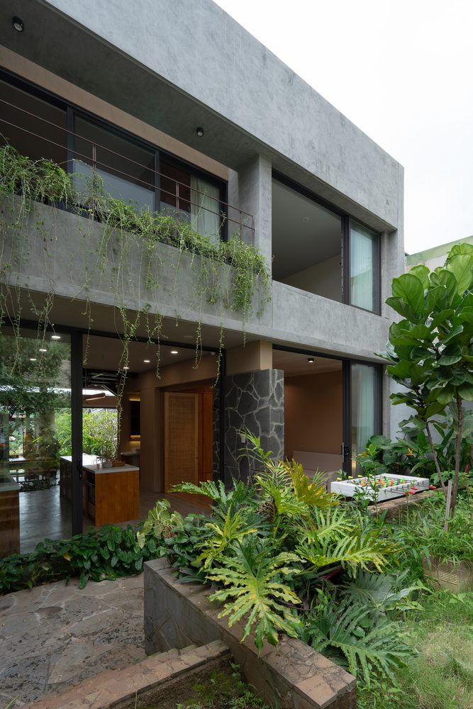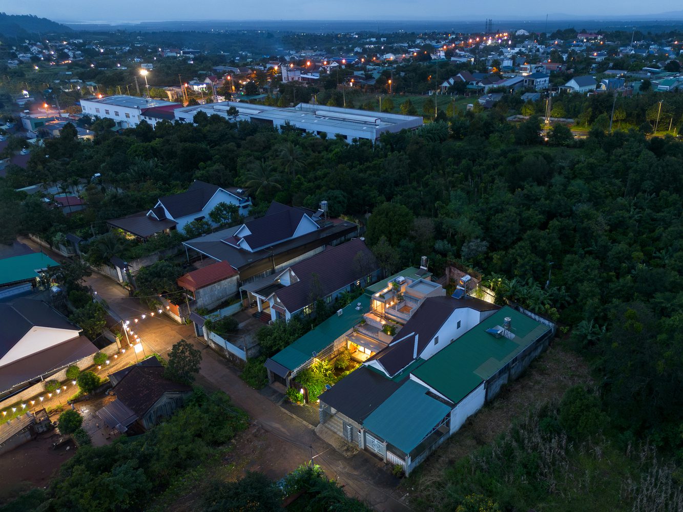 Jinjee House is located in a semi-urban area on the outskirts of Buon Ma Thuot City, on a 7×40-meter plot of land that gently slopes toward a valley. It was designed for a young family of four—a couple and their two sons.