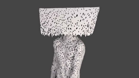 The video reveals different motion of body in a sustained fashion, trying to keep suspense while still showcasing the gleaming paint and its form. The zoomed in camera angle gradually captures and displays different parts of human anatomy ultimately focusing on the innovative rectangular headpiece that conceals the head and neck of human body.