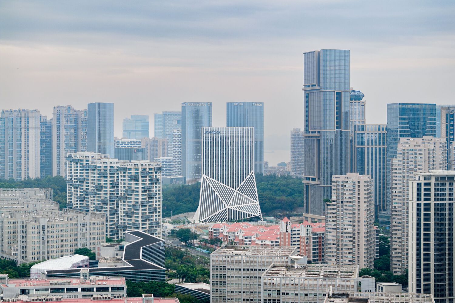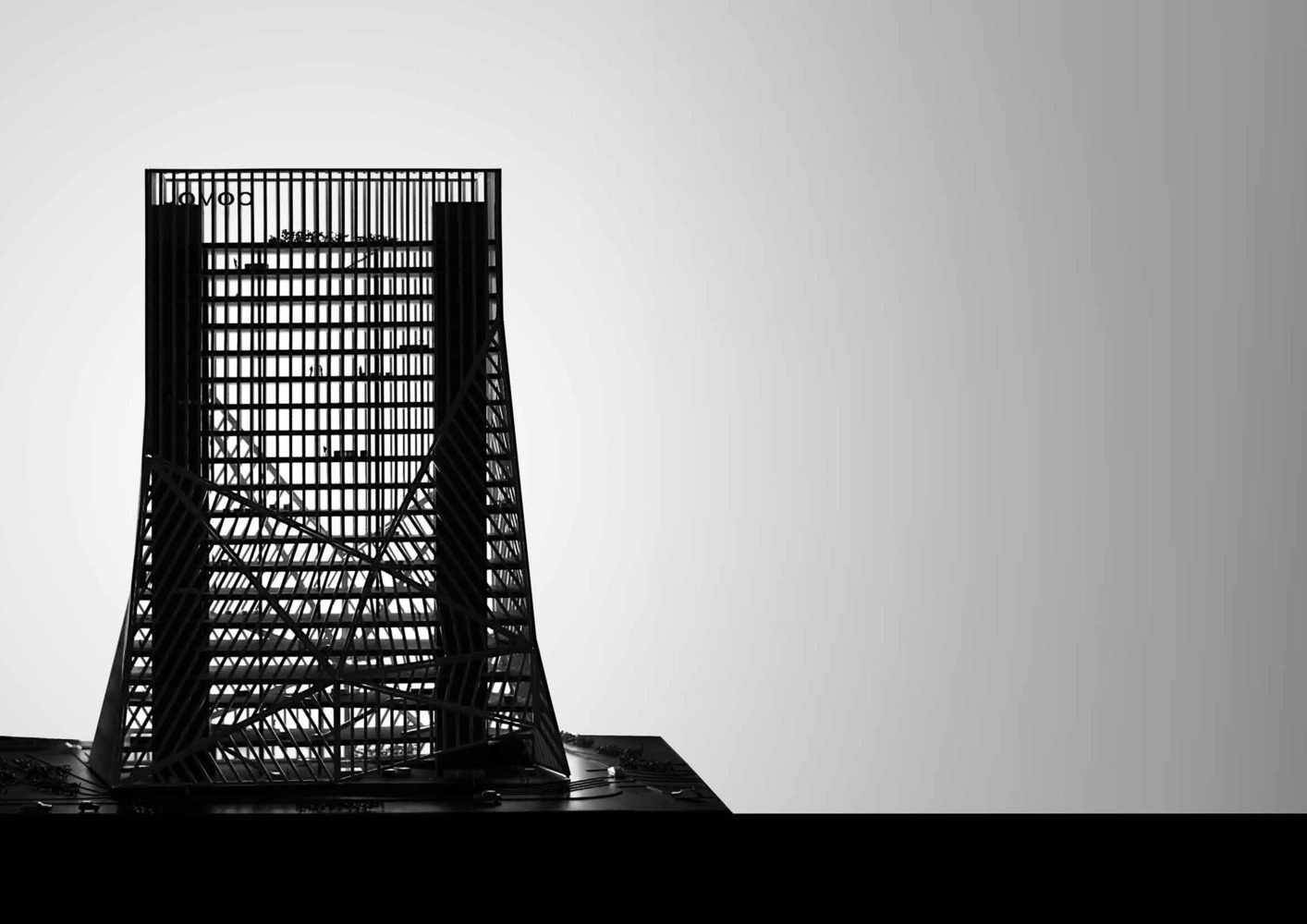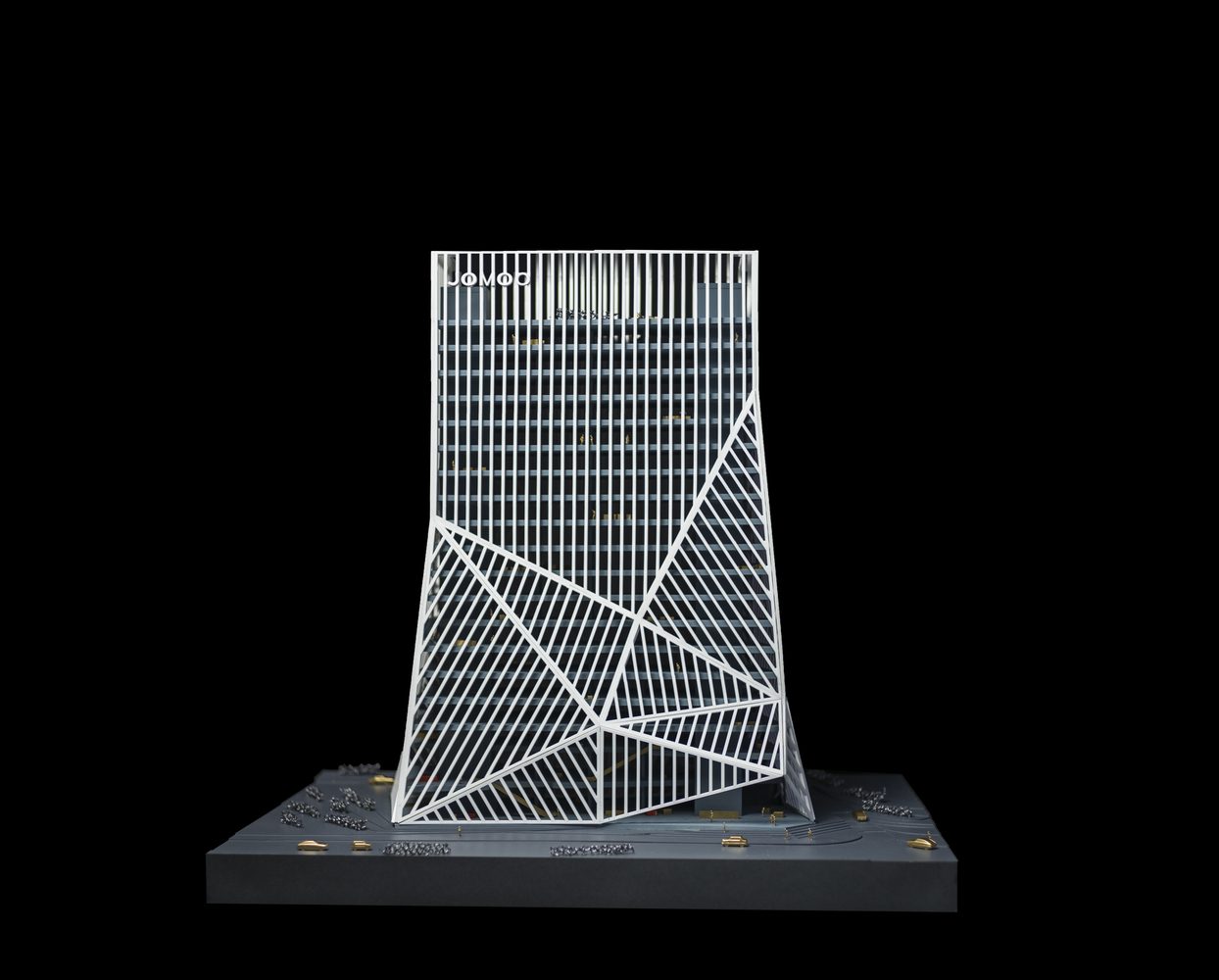 The façade is articulated in white vertical stripes oriented in different directions. Evoking the window tracery typical of houses in the region and recalling JOMOO’s ceramic production, the system defines a distinct visual identity for the building within the city’s rapidly evolving skyline. Inside, it eliminates the need for columns, allowing for flexible and efficient floor plates throughout. Entrances are integrated into the façade where its irregular geometry folds, creating spatially generous and legible access points.
