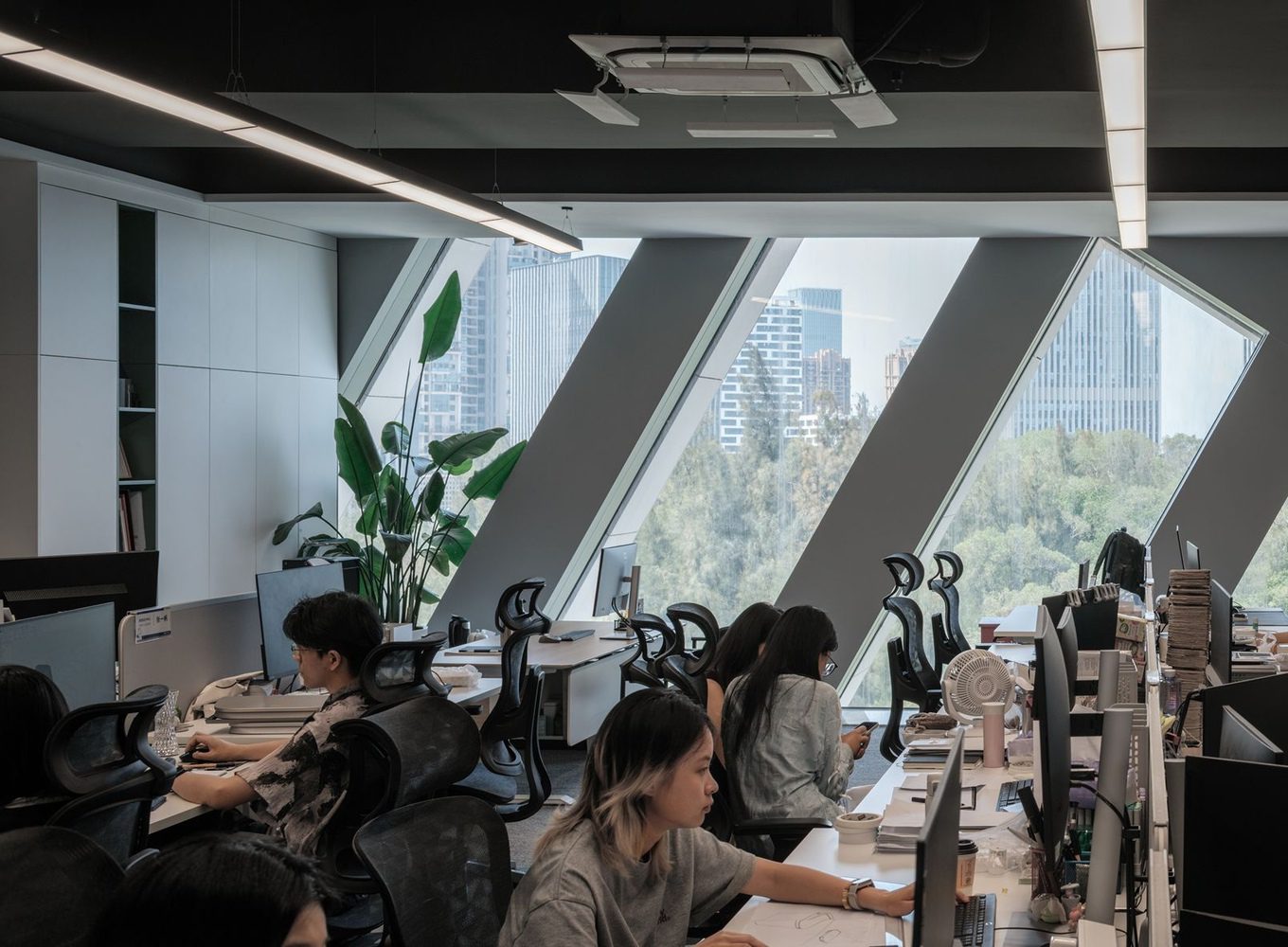 The design responds to this duality through a continuous, sculptural form that reinterprets the conventional podium-and-tower office typology. A multifaceted volume that draws from the rocky terrain nearby hosts the public program: the lobby, a showroom, and a multipurpose hall with conference spaces and recruitment rooms. Above, the tower emerges seamlessly, housing JOMOO’s office spaces.