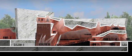 The interior space of the Music Hall overcomes the Euclidean geometry with its amorphous curves and folds, resembling the inside of a cave. Light breaks through the ceiling and provides a mysterious ambience. The building consists of two halls that can be joined together in case of bigger performances. The capacity of the space is 4000 seats, offering flexibility and adaptability. The spot, where the building is located, is between the Torún’s old town and the new development area of the city. The nearby green area has provoked the architects to place a park on the one side of the plot. Panoramic scenery of the river, quoted as a second “miracle” of architecture and landscape in Poland, complements the general architectural concept. Also the height of the construction is carefully adapted to the natural landscape and held as low as possible. The project was granted first prize at the 2010 World Architectural Festival.