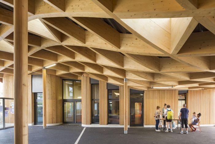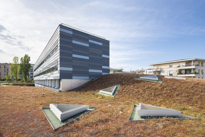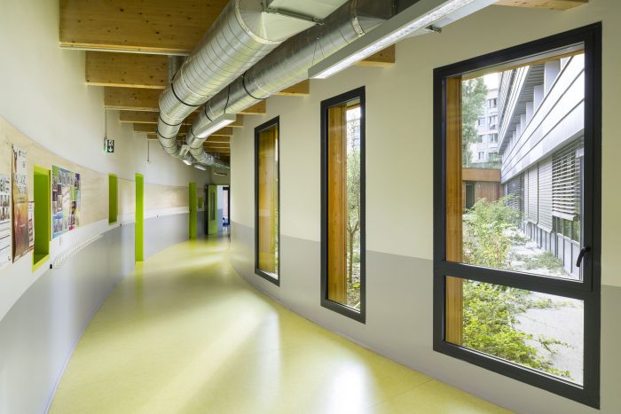 The urban façade unifies all parts of the school in a coherent project. Each part (infant school, primary school, leisure center…) remains independent but reunited in a whole renewed identity. The vegetated roof in the wooden structure on the first floor connects and uni es the three emergences of existing and refurbished parts. Each volume has its function: infant school on East, a primary school on West, leisure centers and common parts on the central zone. The roof and light façades, all in wooden structure allowed to lead works with fewer nuisances indifferent in an occupied site. The parts were pre-fabricated in a workshop to be pieced together quickly and following a dry implementation.