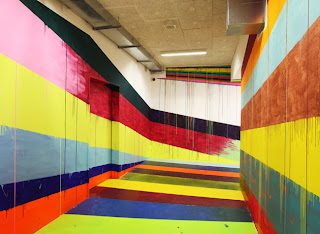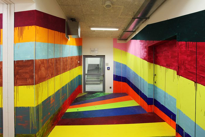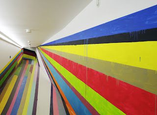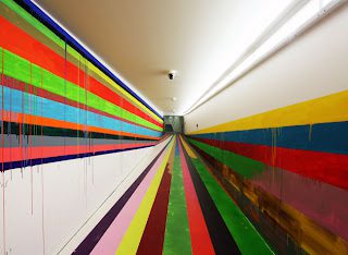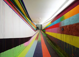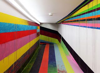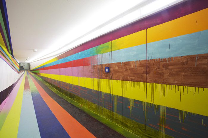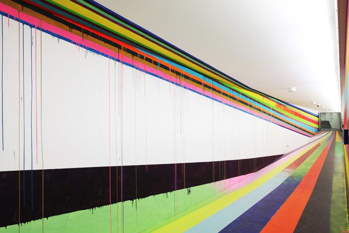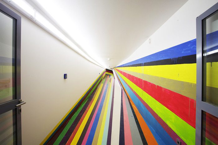 Visitor access has to be underground by law in newly constructed prisons in Germany. This tunnel covers the 40m (about 132 feet) between the security check in the front building and the visitors area in one of the inner prison buildings. Concept for the installation was to create a 3 dimensional painting that follows and surrounds the visitor during the walk through the tunnel. Two sets of diagonal stripes that both grow wider while covering the distance build two different perspectives.