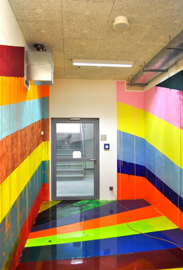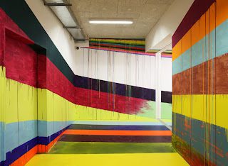 This recent commission for the German-born and Brooklyn-based artist Markus Linnenbrink is in stark contrast to what one would expect to find as a visitor to a prison. Yet this is exactly what it is. The new prison in Düsseldorf, Germany named Justiz Vollzugs Anstalt, is said by the artist to be a model institution and thus in keeping with its treatment of both humanity and security, a unique approach to the visitor’s entrance was needed. The artist describes the project stating.