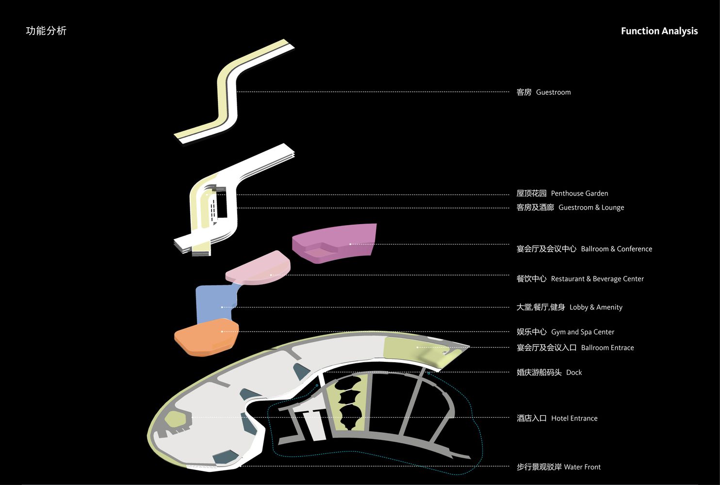 The design introduces water elements on-site that connect with adjacent water resources and landscaped parks -creating a unique water transit system to augment the hotel and conference experience. The movement of water is also reflected in several hotel terraces with clustered, outdoor gardens. The intent is to create several smaller enclaves where hotel guests can enjoy their natural settings and vistas in this unique site.