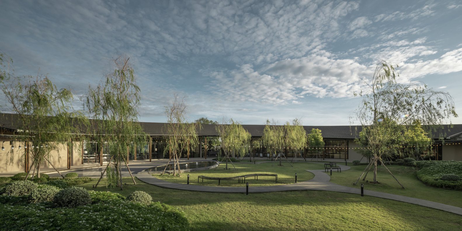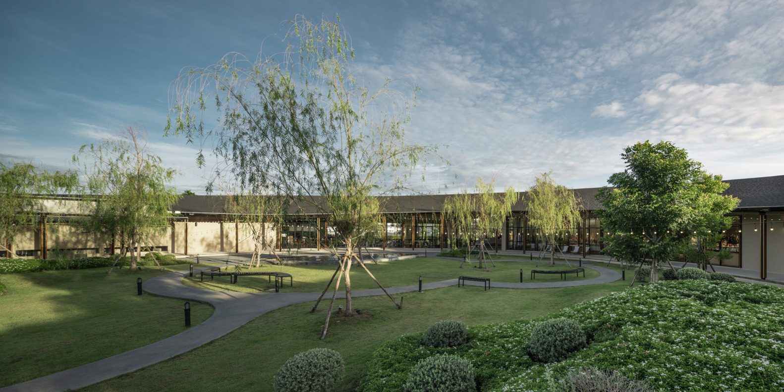 The design concept of Kaew Boutique is based on the surrounding natural environment, with mountains in front of the site and surrounding buildings in a square shape. The building has a divided courtyard space, similar to the structure of an egg yolk, to create a common area for shared activities where people can interact. The designer has also considered the sun, wind, and rain direction and designed the shape of the roof, the same as a mountain, to open up the view of the mountain. The designer chose to use materials that blended with the surrounding natural environment, built a raised mound, and used various types of plants to make the building look more approachable and friendly.