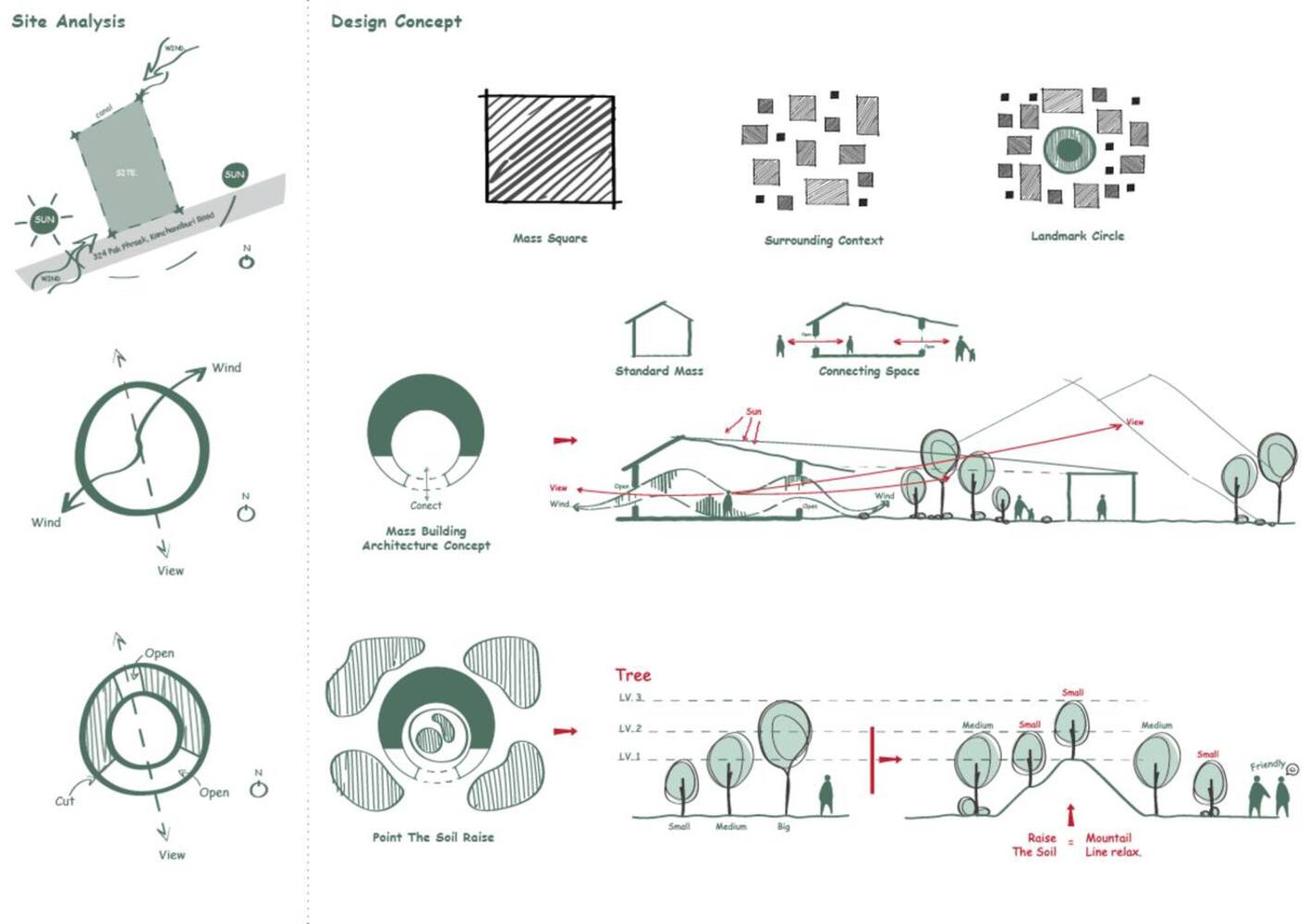 In conclusion, the goal was to create a space where people could relax while using the services. The design was also intended to be able to coexist with the weather conditions of Thailand which included reducing the shape of the building to a circular form. The overall approach was to keep the design humble but symbolically sustainable.