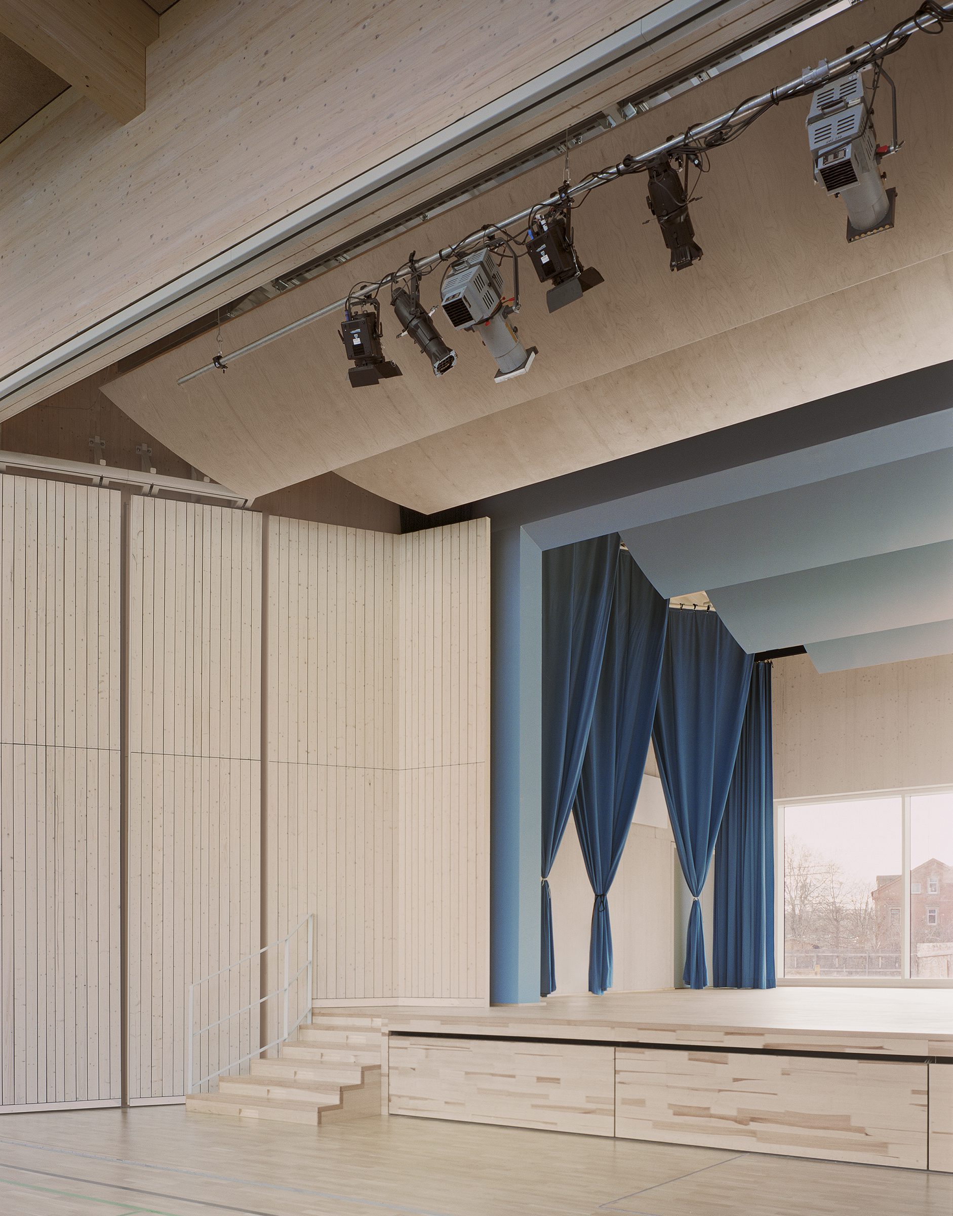Multi-purpose Hall. In response to the constantly changing needs and requirements of school teaching, the focus here is on the multifunctionality of the building. The single-field hall not only offers pupils the opportunity to do their sports lessons here, it is also a new event venue for the school. This multiple use is achieved with the help of a mobile partition wall that separates a 90 cm raised stage from the sports area. When closed, the stage area can also be used for rehearsals during lessons. For events with a stage presence, the wall can be opened and up to 500 people can be seated on the sports field and on a telescopic stage that can be pulled out. The stage also opens up to the schoolyard and can also be used as an outdoor stage on warm summer days. The generously designed foyer also offers enough space for larger crowds and is also a meeting point before lessons during the school day.