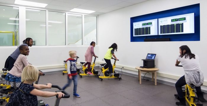 “The school’s many sustainable design features include photovoltaic arrays wrapping both the roof and south facade, a geo-exchange heating and cooling system, energy recovery ventilators and demand-control ventilation, and a solar thermal system for hot water. Horizontal deep-set clerestory and vision windows on the school’s south facades shade the glass from solar heat gain. On the east, west, and north facades, precast concrete rainscreen panels form a very tight enclosure to help minimize air infiltration“, explained SOM.