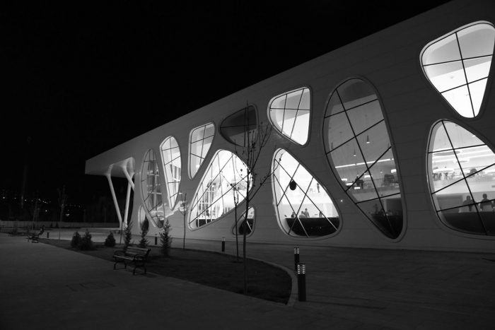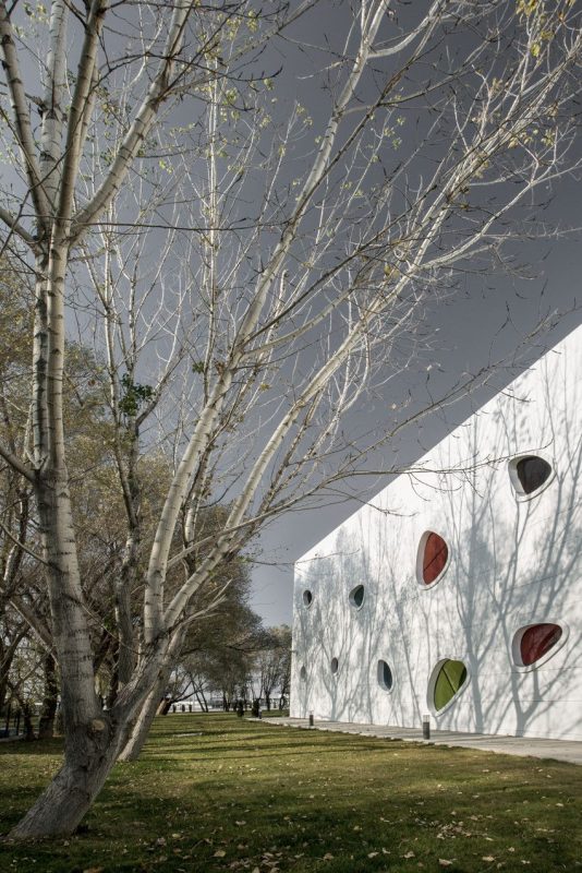 The roof which extends to the entrance, forms like a fringe and covers the roof patio, while the clear structure reaches to a rectangle shape. This clear prism shaped amorphous structures become noticeable and make a difference with the amorphous gaps. The colored glasses on the amorphous gaps validate that the structure was intended to build for entertainment and sports.