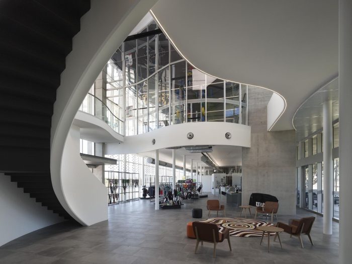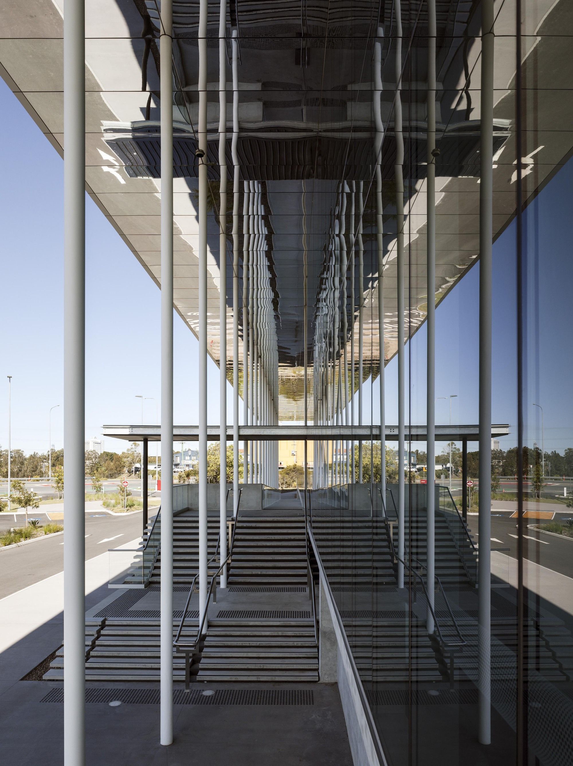 Transparency and reflection bring the outside environment into the building, to which exposed concrete creates contrast, with the mirrored soffit drawing the image of the sky onto its glass walls.The reflections enable the building to announce itself from a distance, giving it a presence greater than its envelope and clearly framing the activities of sports people, community members and students taking place within.