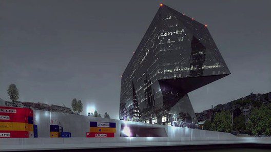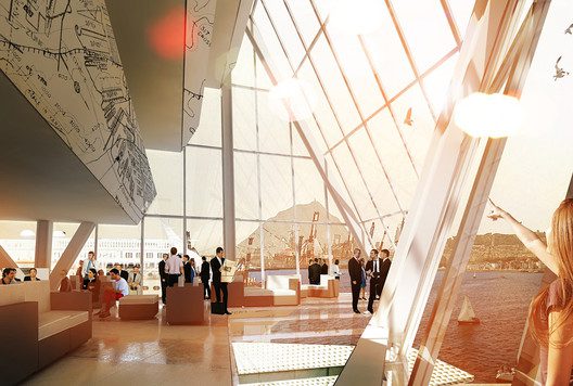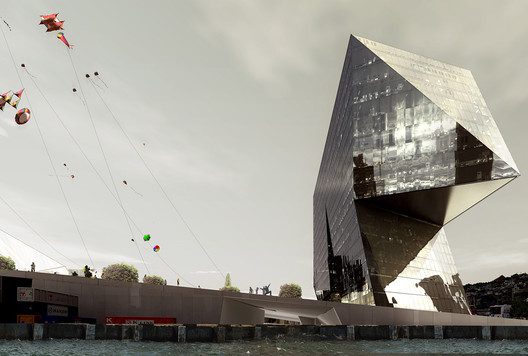 The structure of the buildings rubs against each other like continental shelves making it possible for the complex of public, transit, and industrial activities to coexist. This is one architectural element: a permeable, open architecture of maximum efficiency encompassing the tower, terminal, and cargo storage. Parallel to the harbor, transit is organized by one large band. Split arrival and departure bands organize traffic to and from the ships with maximum efficiency; while the separate tower and cargo access ensure utilitarian viability.