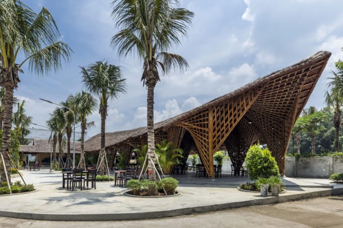 Located in the heart of Long Thanh, a bustling town in southern Vietnam that is experiencing rapid growth due to a significant international airport project, the Keeng Seafood Restaurant complex offers conference halls, private dining rooms, a kitchen, a restroom, and a bamboo hall. The bamboo hall is unique and stands out with its gently curved boat-shaped thatched roof, supported by bamboo structures that resemble nipa palms, a common riverside plant in southern Vietnam.