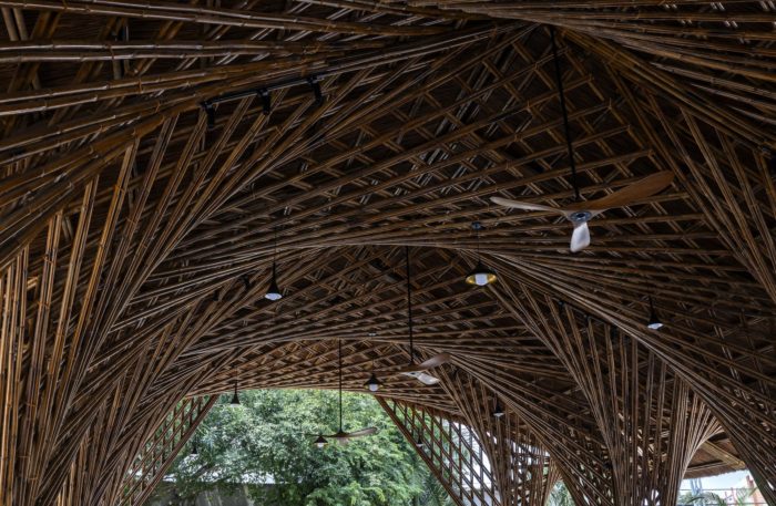 The bamboo hall features numerous hypars that serve as both ceilings and columns. These hypars are interconnected and interlocked, allowing the overhanging roof to extend to 4 meters at the gable roof. A hypar is a surface that is doubly curved and doubly ruled, which makes it easy to construct using straight structural members. Utilizing bamboo poles to build hypar structures is an ideal match since it allows for creating curved surfaces using straight bamboo poles, resulting in exceptional stiffness and an attractive form without the need for bamboo bending.