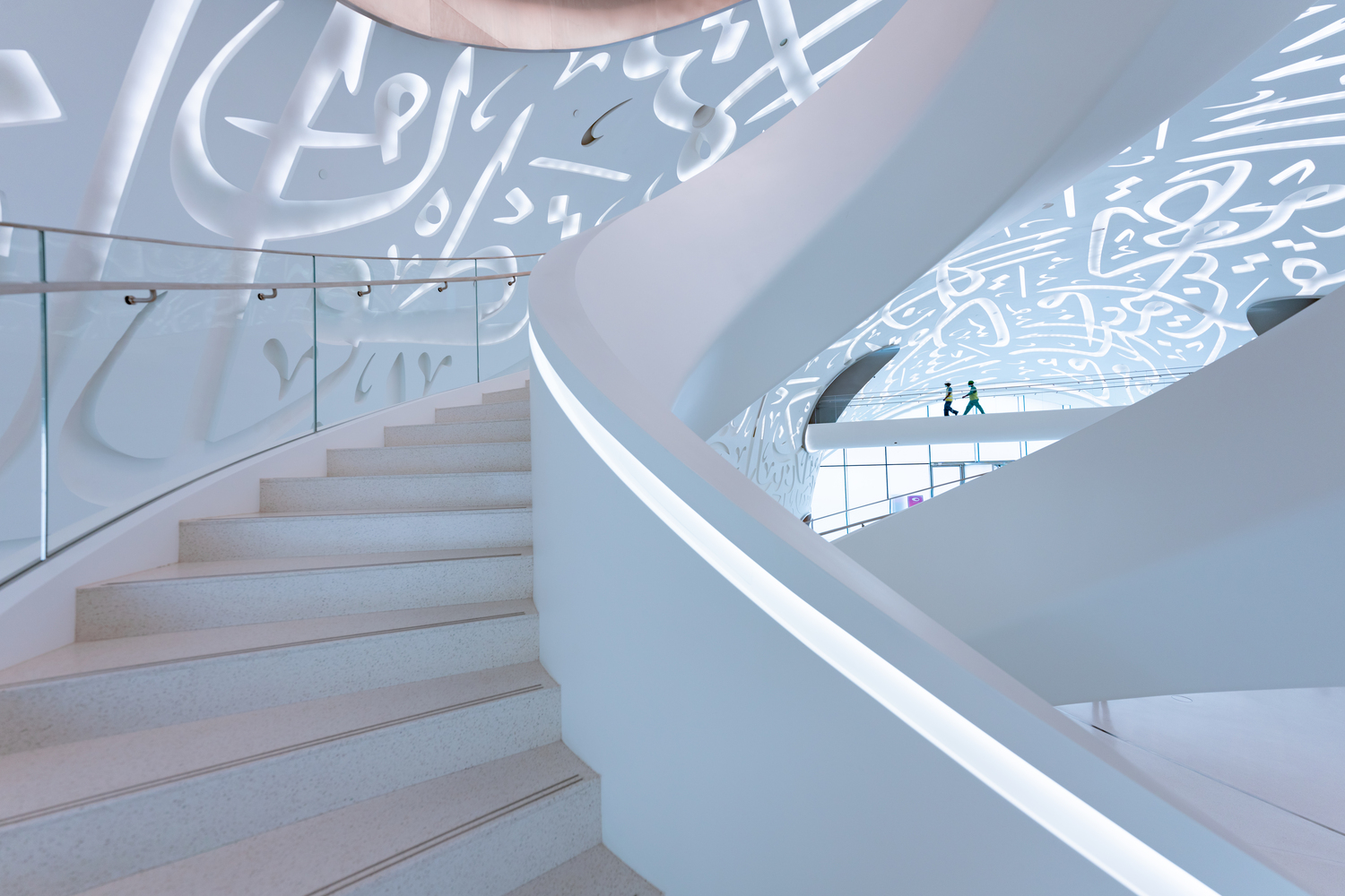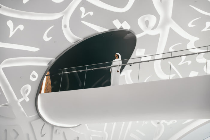 While the torus-shaped volume rises 77 meters above ground level and displays artistic Arabic calligraphy that is perforated into its shell. The calligraphy features an Arabic poem written by the ruler of Dubai about the emirate’s futuristic goals and aspirations. Over 1,000 fire-retardant composite panels covered in stainless steel, each individually created, make up the scripture that doubles as windows. The bold shape of the volume symbolizes humanity’s strength, artistry, and ability to create in harmony with its surroundings.