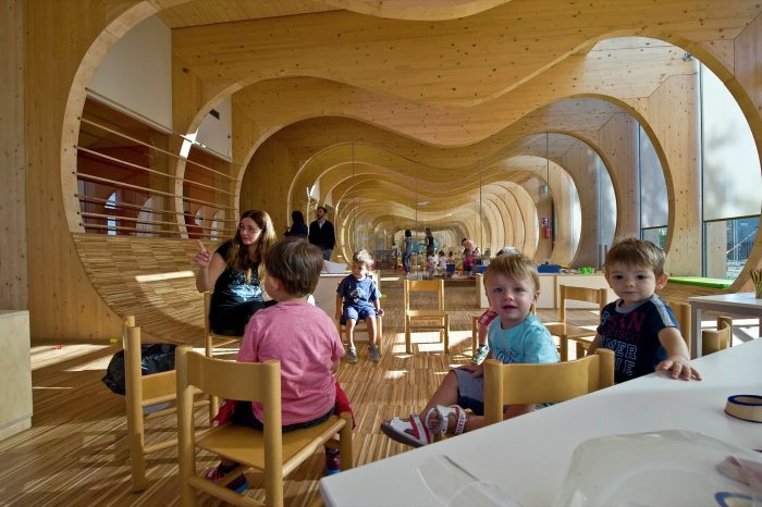 Architectural elements of the new kindergarten by MCA – like the shape of the interior, their organization, the choice of materials, all the sensory perceptions related to the light, the colors, the sounds, the tactile suggestions – are designed taking into account of the pedagogical and educational related to the growth of the child.