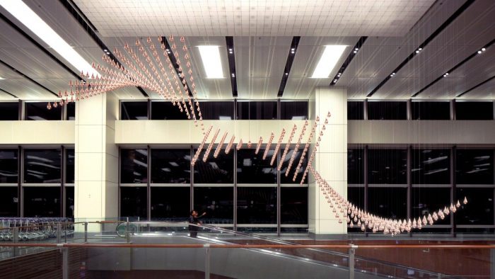 Art + Com have recently installed a beautifully choreographed installation in Terminal 1 of Changi Airport in Singapore. It consists of raindrops made from lightweight aluminum covered in copper which are raised and lowered in a 15-minute computationally designed choreography.