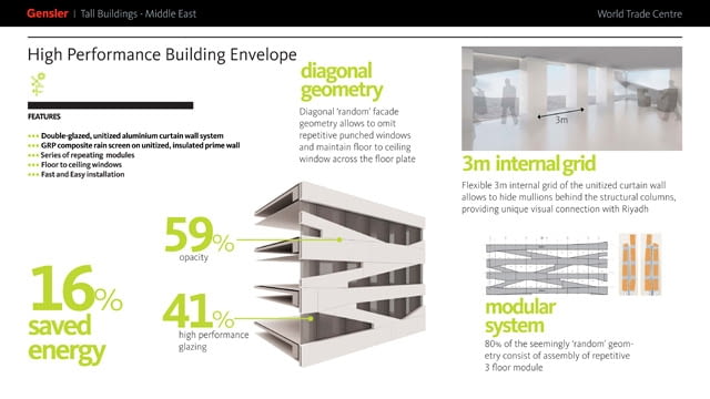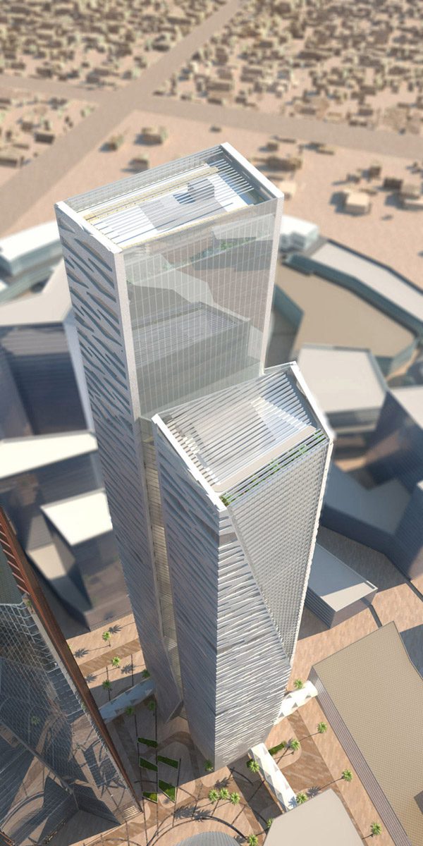 The Vertical Wadi generates the formal and organizational structure to the tower, linking all internal functions and cleaving the building mass in two. It is broken down into office zones of 12 floors and then again into business communities of 3 levels creating a scalable working environment. To support the needs of the smaller tenants, the tower provides a high proportion of managed amenity space, ranging from a full conference auditorium to executive club areas and business lounges. The general public is also encouraged to experience the building with an observation deck at 300m.