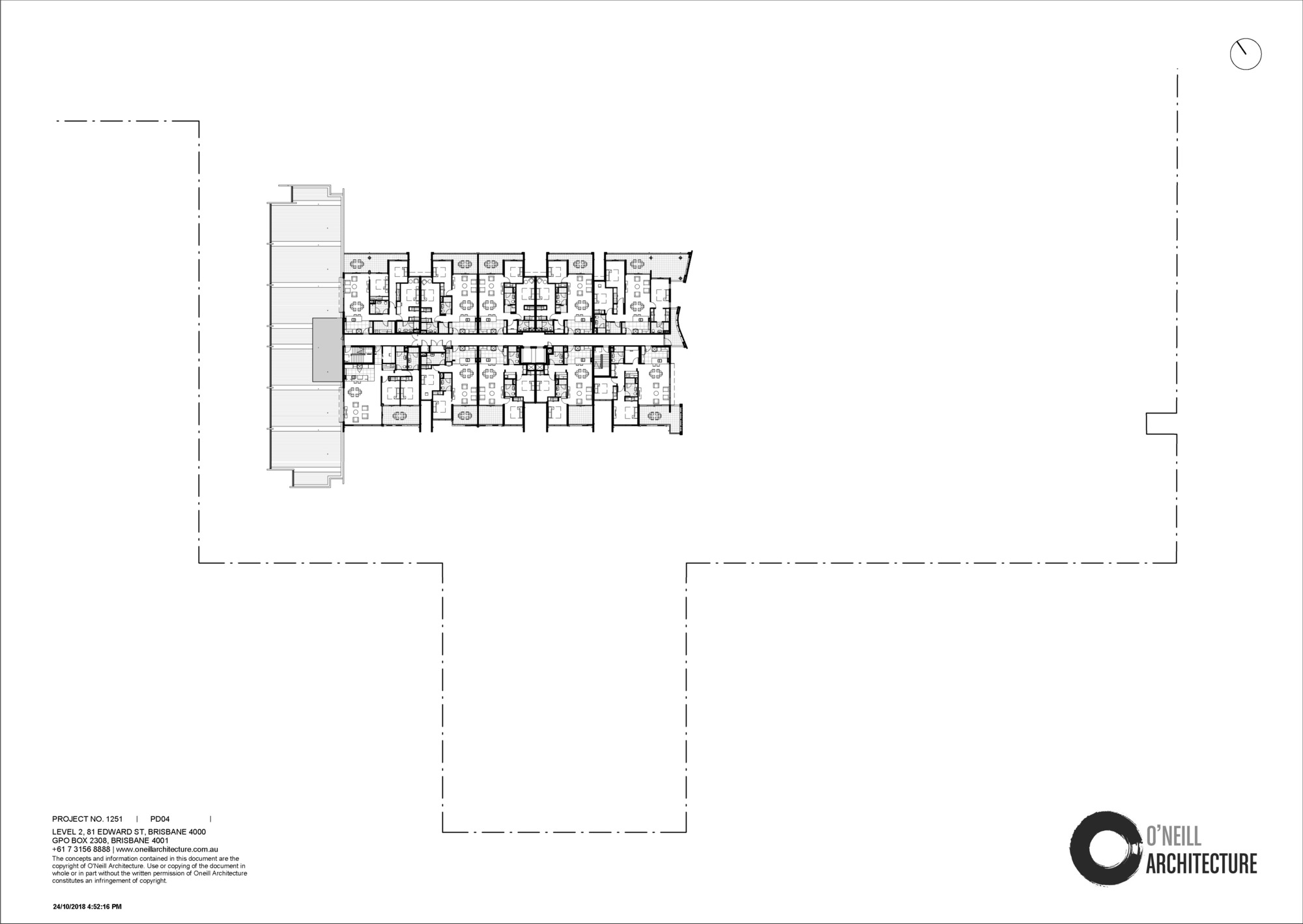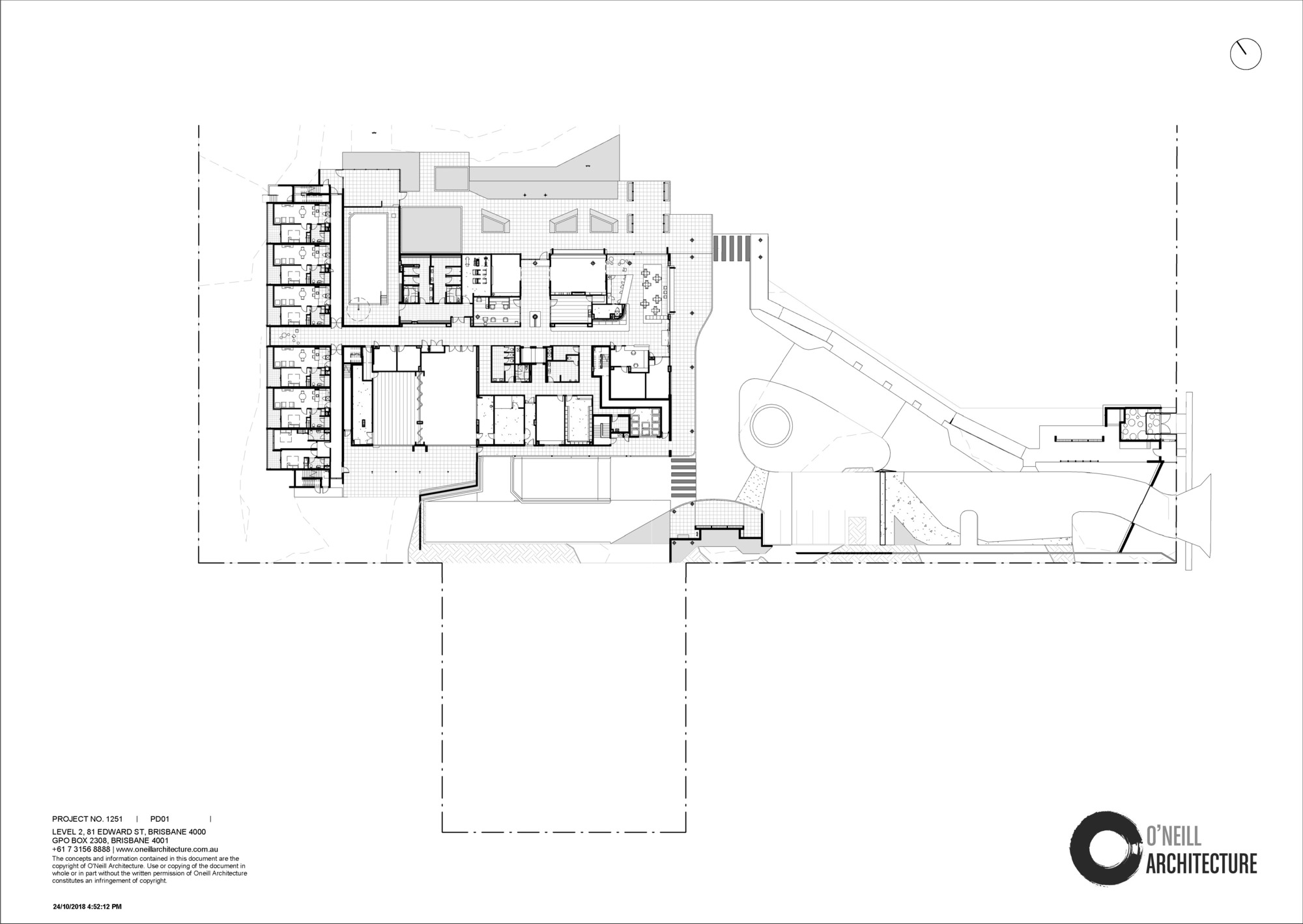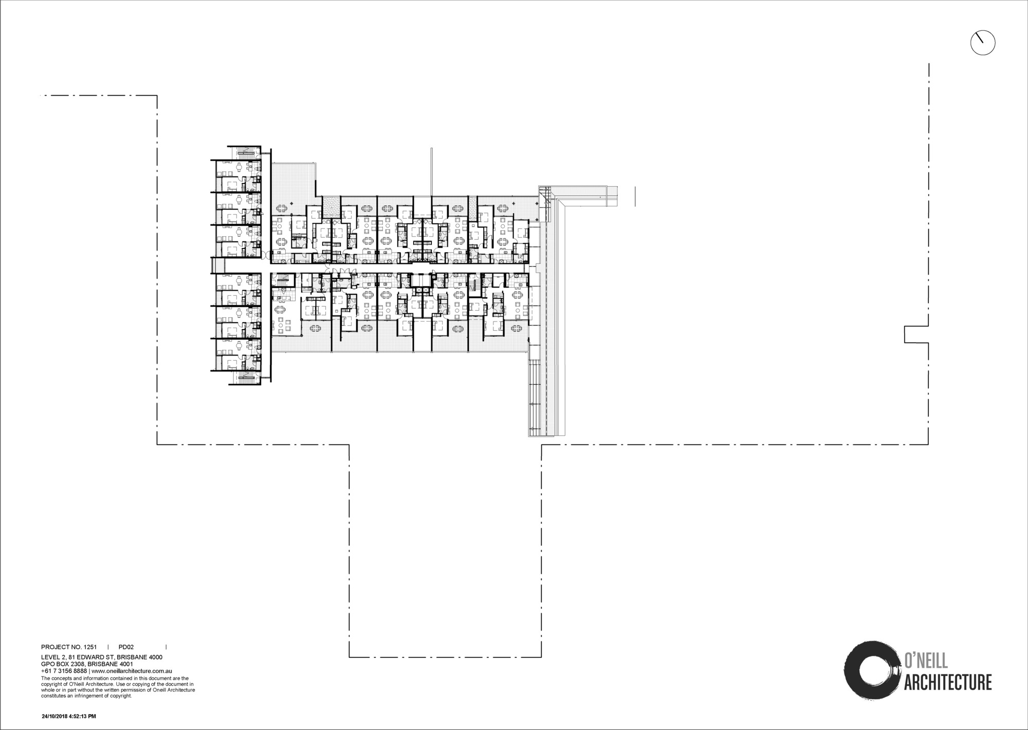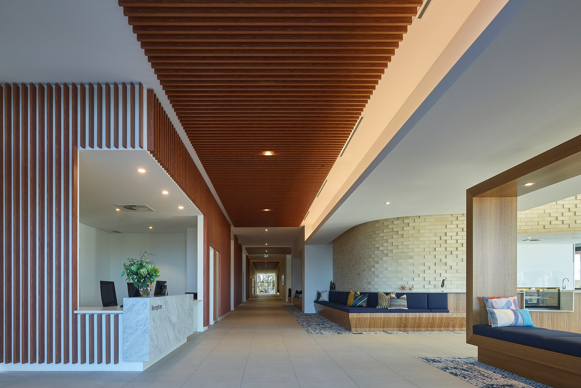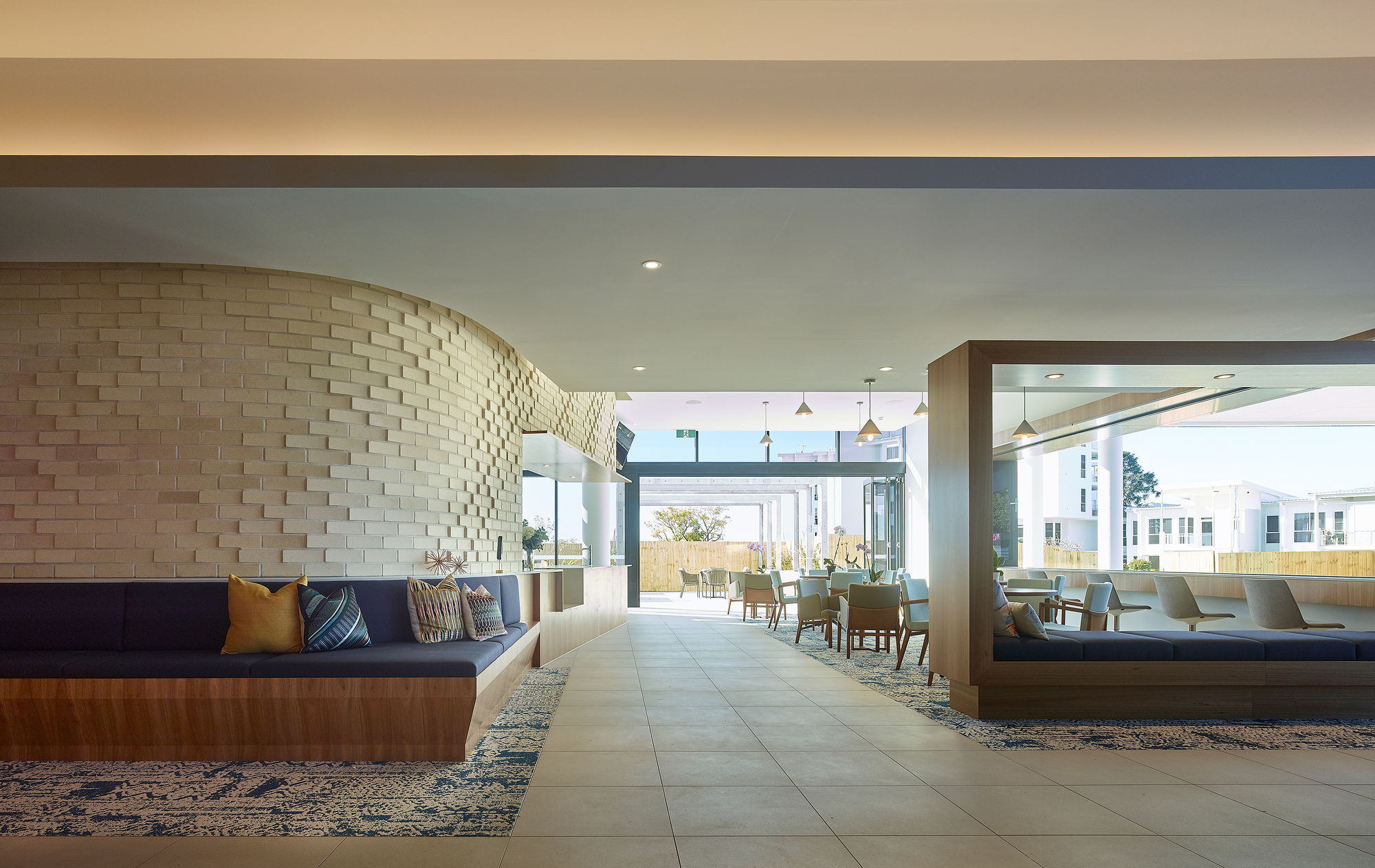 Kingsford Terrace , ‘Duporth’ is the first stage of the Masterplanned Retirement Village, Kingsford Terrace. Located in Corinda, it will create a community of over 300 residents when completed. This first stage includes extensive ground floor community facilities, 54 apartments and 18 care studios. The main address of the building is adorned with large brick screen wings. The scale of these screens are in proportion with the surrounding site, and provide a highly crafted and welcoming entry that marks the Duporth building as the hub, and offers some insight as to the scale of the community within.